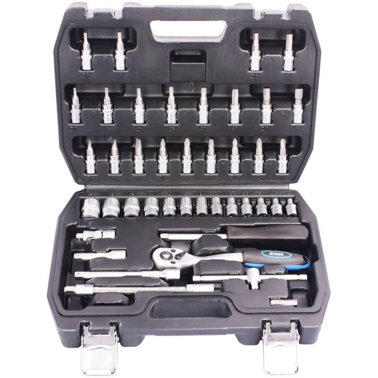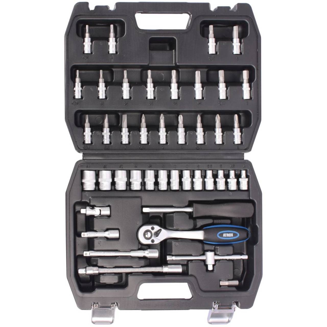 Der ATROX Steckschlüsselsatz AY552 bietet eine sechsundvierzig-teilige Auswahl an hochwertigen Werkzeugen. Alles sortiert im praktischen Koffer. Der Steckschlüsselsatz für Ihren Heimwerkerbedarf, welcher in keiner Werkstatt fehlen darf.