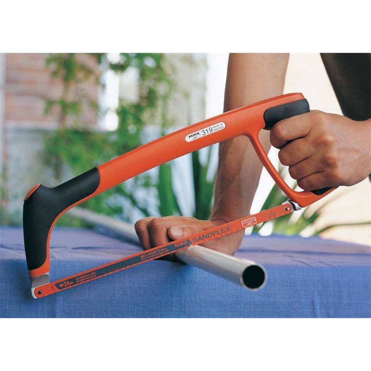 Für Arbeiten an schwer zugänglichen Stellen ist eine Bahco Mini-Bügelsäge im Metallsägebogen 319 Set enthalten. Sie verfügt ähnlich wie ihr großer Bruder über ein hochwertiges sowie unzerstörbares SANDFLEX® Bimetall-Sägeblatt. Die Gesamtlänge des Blattes beträgt 250 Millimeter, kann aber mühelos in der Länge angepasst werden. Ermöglicht wird dies durch den cleveren Feststellknopf am Kopf des Werkzeugs. Die Mini Bügelsäge ist sicher & unkompliziert in der Handhabung. Ein Druckguss-Rahmen verspricht eine hohe Haltbarkeit des Werkzeugs.