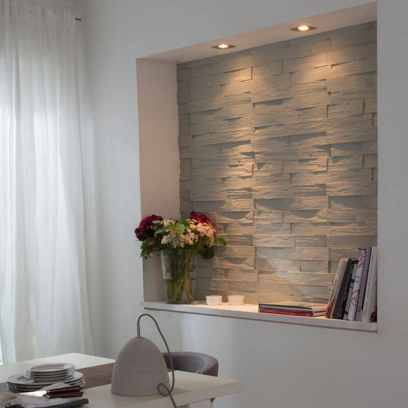 Der Untergrund sollte sauber, trocken, fest und glatt sein, damit die Paneele sicher haften. Verteile den Styroporkleber gleichmäßig auf der Rückseite der Wandpaneele. Drücke die Paneele an der gewünschten Stelle fest an, damit die Kanten bündig abschließen. Zur besseren Ausrichtung kann die Position vorher mit einem Bleistift markiert werden. Kleine Fugen lassen sich mit Spachtelmasse oder Klebstoff verschließen. Nach einer Trocknungszeit von etwa 48 Stunden ist die Fläche bereit für die weitere Bearbeitung.