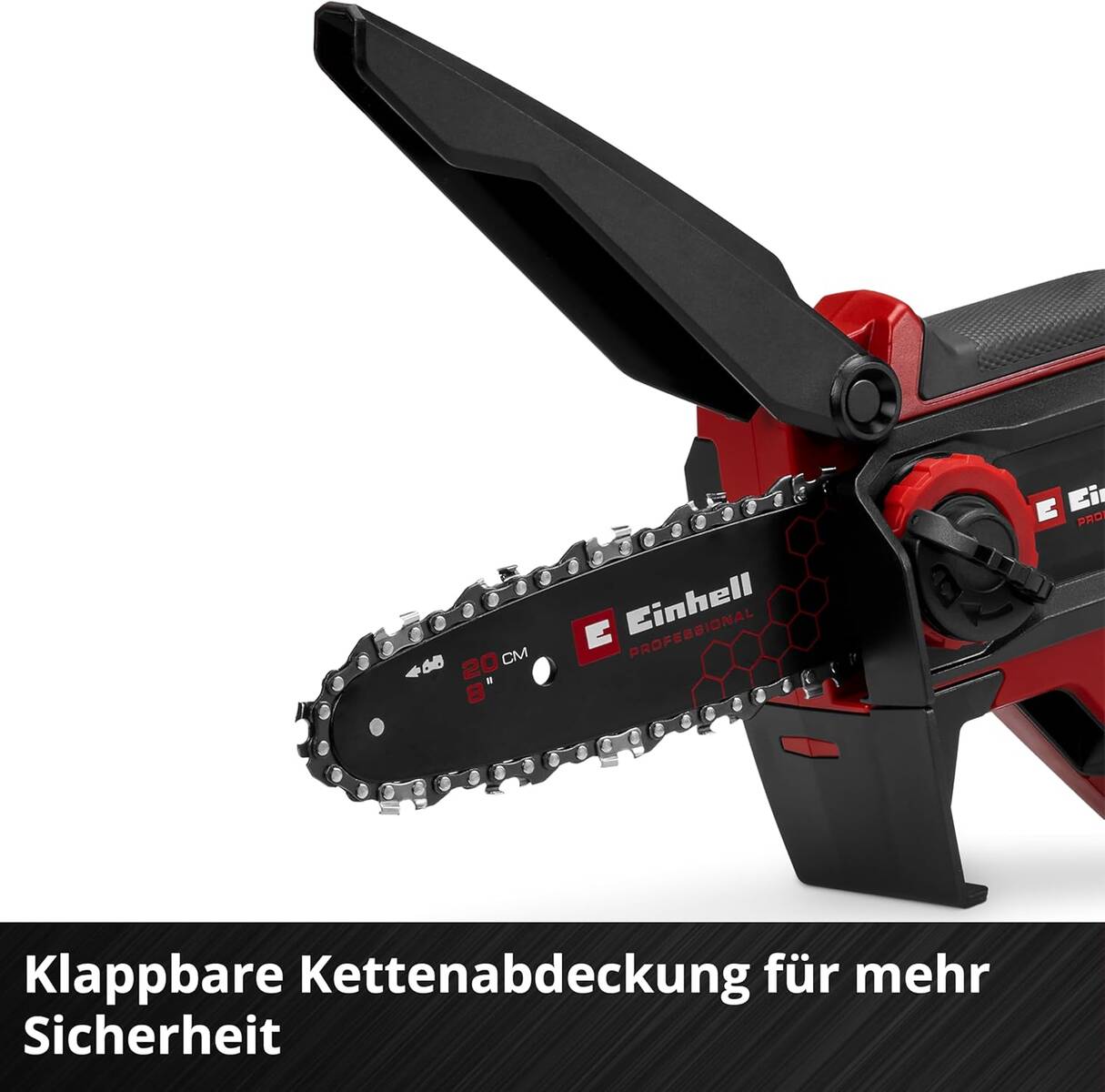 Für Sicherheit und Flexibilität sorgen ein integrierter Handschutz. Die klappbare Kettenabdeckung schützt Anwender und Maschine gleichermaßen. Das ergonomische Design macht sich dank schlankem Griff und Softgrip-Flächen bemerkbar. Einhells GP-PS 18/20 Li BL-Solo Professional Akku-Astkettensäge lässt sich beidhändig nutzen. Die Handablagefläche dient dem sicheren Arbeiten mit zwei Händen. Sie sorgt darüber hinaus für einen hohen Komfort im Betrieb. Eine Schwertabdeckung schützt das Gerät bei der Lagerung. Zum sauberen Nachfüllen der automatischen Kettenschmierung ist ein Öl-Einfülltrichter inklusive. Die Lieferung erfolgt wie bei allen Sologeräten ohne Akku & Ladegerät. Diese sind separat als Starter-Set oder einzeln erhältlich.