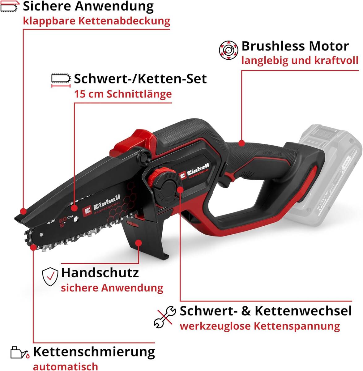 Als Teil der Power X-Change Familie von Einhell ist die Akku-Astkettensäge mit Akkus und Ladegeräten der Systemreihe nutzbar. Sämtliche 18-Volt-Batterien lassen sich untereinander kombinieren. Angetrieben wird das Gartenwerkzeug vom kraftvollen Einhell Brushless-Motor. Dieser bürstenlose Motor bietet Anwendern mehr Kraft plus eine längere Laufzeit gegenüber herkömmlichen Kohlebürsten-Motoren. Registrierst du deine GP-PS 18/20 Li BL-Solo Akku-Astkettensäge online, gelten 10 Jahre Garantie auf den Brushless-Motor.
