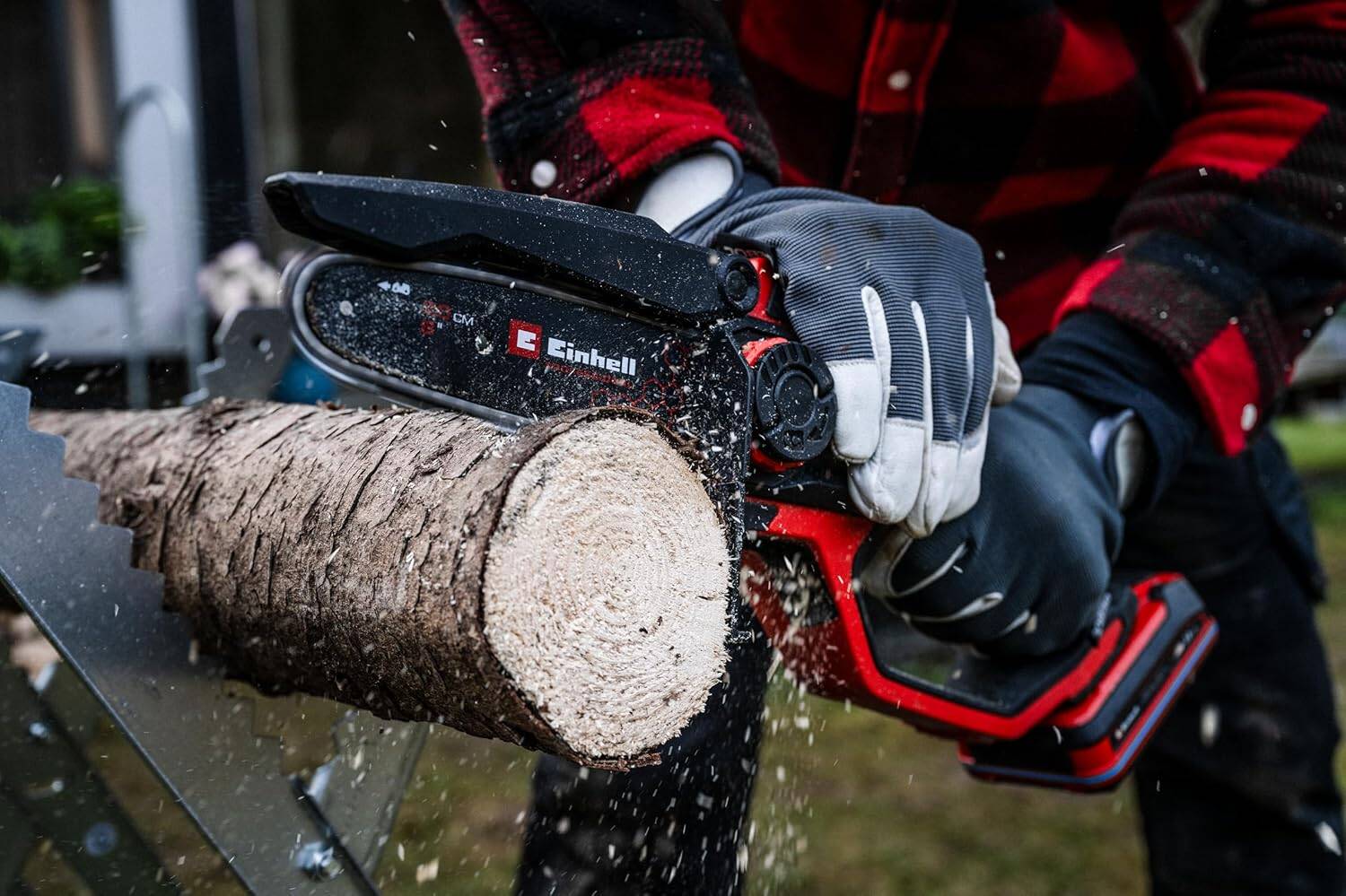 Die Schwertlänge gibt Einhell mit 19,2 Zentimeter an. Bei einer Schnittlänge von 15 Zentimetern lässt sich das die Professional Akku-Astkettensäge gut händeln. Somit eignet sich die kompakte & zeitgleich leichte Säge für flexible Einsätze im Grünen. Der effiziente Motor minimiert Vibrationen spürbar. Er ermöglicht zudem eine Kettengeschwindigkeit von bis zu acht Metern in der Sekunde. Zur Ausstattung gehört ein Schwert- und Kettenset, das dir präzise Schnitte ermöglicht. Wartungsarbeiten wie der Wechsel von Schwert und Kette erledigst du werkzeuglos. Auch die Kettenspannung lässt sich dank werkzeugloser Bedienung leicht durchführen.