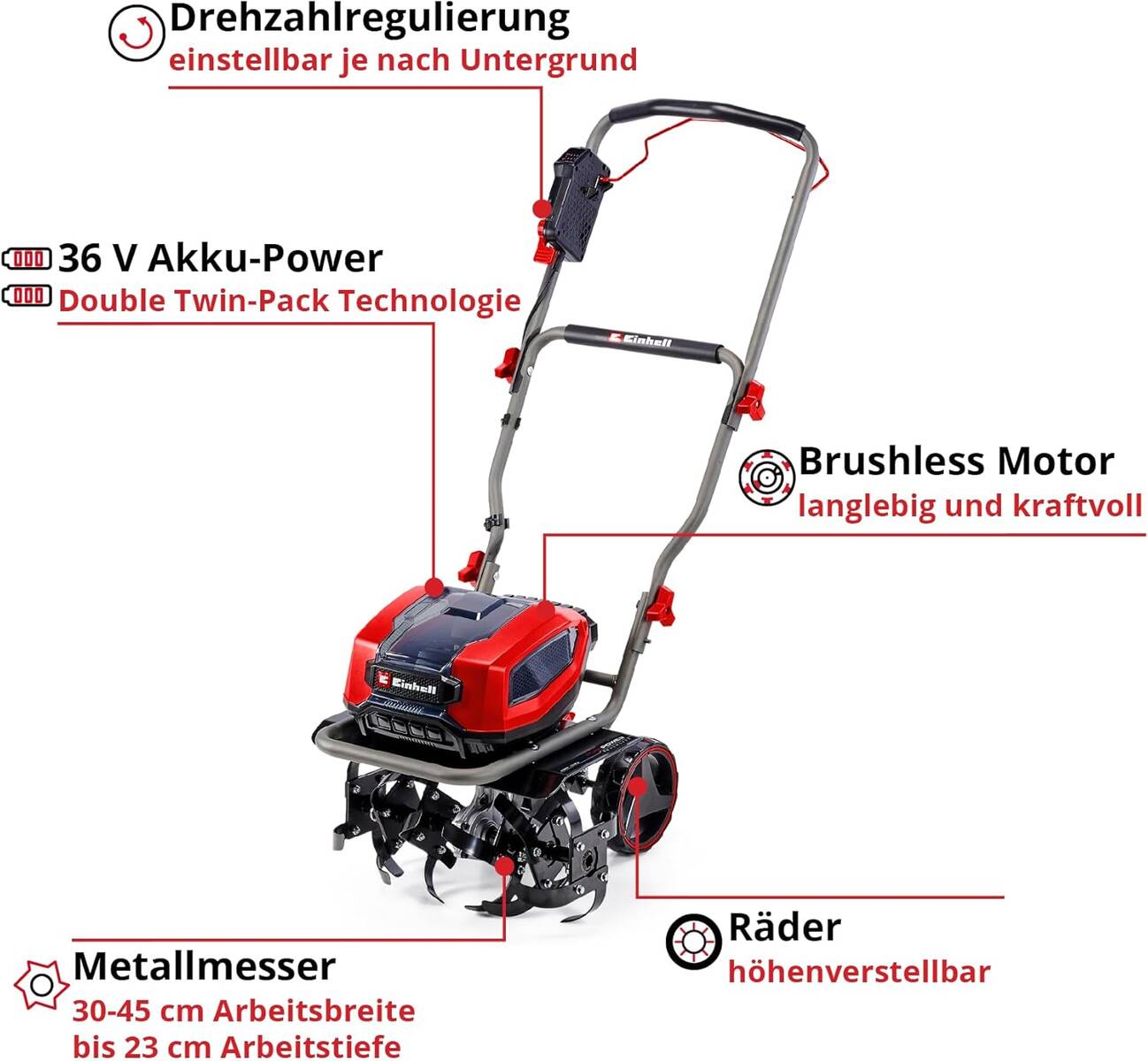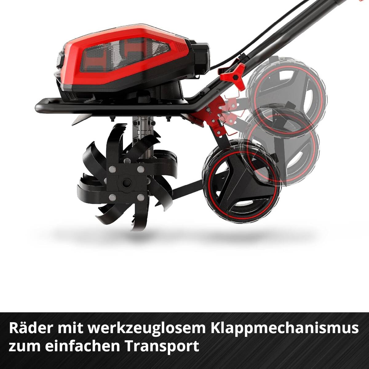 Damit die Akku-Bodenhacke GP-CR 36/45 Li E BL-Solo präzise in der Spur bleibt, spendiert Einhell dem Modell einen Bremssporn. Der Sporn an der Gerätehinterseite hilft dir bei der Einstellung der Arbeitstiefe und kontrolliert die Zugkraft im Betrieb. Gemüse- oder Blumenbeete lassen sich so bequem und kabellos auflockern und anschließend umgraben. So bereitest du dein neues Beet im Handumdrehen vor, alles ohne schweißtreibende Handarbeit. Damit dir das Arbeiten komfortabel von der Hand geht, lässt sich der ergonomisch geformte Führungsholm klappen. Eine LED-Anzeige am Griffende zeigt dir den Batterieladestand für jeden einzelnen Akku an. Als weiteres Ausstattungsmerkmal besitzt die Akku-Bodenhacke GP-CR 36/45 Li E BL-Solo von Einhell höhenverstellbare Räder. Dank eines Griffes transportierst du das Gartengerät im Handumdrehen von einem Beet zum nächsten. Für deine Sicherheit im Betrieb sorgen zum einen der Zwei-Punkt-Sicherheitsschalter und ein Messerschutzblech. Die Lieferung erfolgt wie bei allen Solo-Gartengeräten ohne Akkus und ohne Ladegeräte. Freue dich auf ein mächtiges Werkzeug mit vier Akkusteckplätzen und vielen weiteren Features. Mit der PROFESSIONAL-Serie von Einhell, bekommst du mehr Gartengerät fürs Geld!