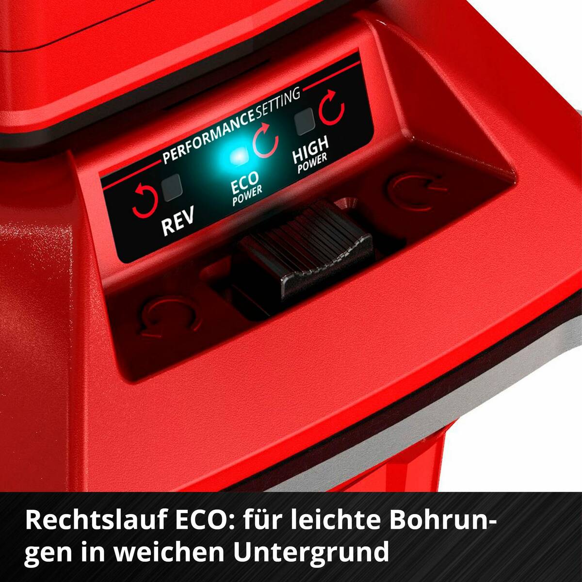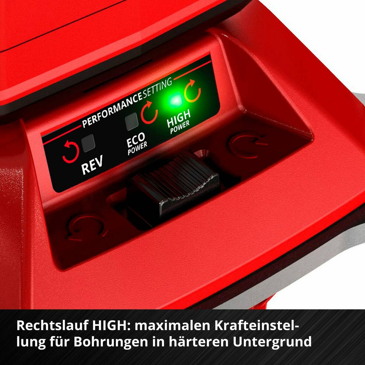 Darüber hinaus stattet Einhell das Akku-Gerät mit einem Aluminium-Getriebegehäuse aus. Der Erdbohrer lässt sich auf drei verschiedene Modi einstellen. Modus eins, der Linkslauf. Er löst den Bohrer nach der Arbeit mühelos aus der Erde. Für Aufgaben mit normalem Kraftaufwand bietet sich der Rechtslauf im ECO Power-Modus an. Die zweite Krafteinstellung eignet sich für leichte Bohraufgaben in weichem Untergrund. Natürlich ist nicht überall lockeres Erdreich anzufinden. Die dritte Rechtslauf-Einstellung beschreibt den HIGH Power-Modus. Er bietet dir die größtmögliche Leistung bei harten Untergründen. Der Der Einhell Akku-Erdbohrer GP-EA 18/150 Li BL-Solo sorgt dank Metallrahmen für maximale Stabilität und Verwindungssteifigkeit im Betrieb. Für eine praktische Handhabung sorgt ein Doppelhandgriff mit Softgrip. Ideal für dein ergonomisches Arbeiten gerade bei längeren Einsätzen.