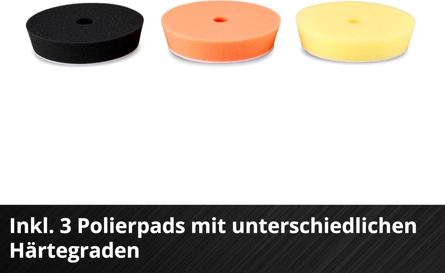 Der Akku-Exzenterpolierer CP-EP 18/125 Li BL-Solo liegt gut in der Hand, wenn du ihn benutzt. Der Knauf- und der Zusatzhandgriff helfen dir, das Werkzeug präzise zu steuern. So bringt das Arbeiten mit einer Poliermaschine mehr Freude! Der Polierteller von Einhell beträgt laut Datenblatt Ø 125 Millimeter im Durchmesser. Per Mikrokletthaftung wechselst du passende Aufsätze schnell und einfach. Im Lieferumfang sind drei Polierpads mit verschieden Härtegraden enthalten. Die Akku-Exzenterpolierer CP-EP 18/125 Li BL-Solo aus dem Hause Einhell kommt als Sologerät ohne Akku und Ladegerät. Das Zubehör ist nicht im Set enthalten und muss separat erworben werden.