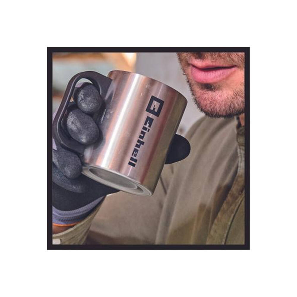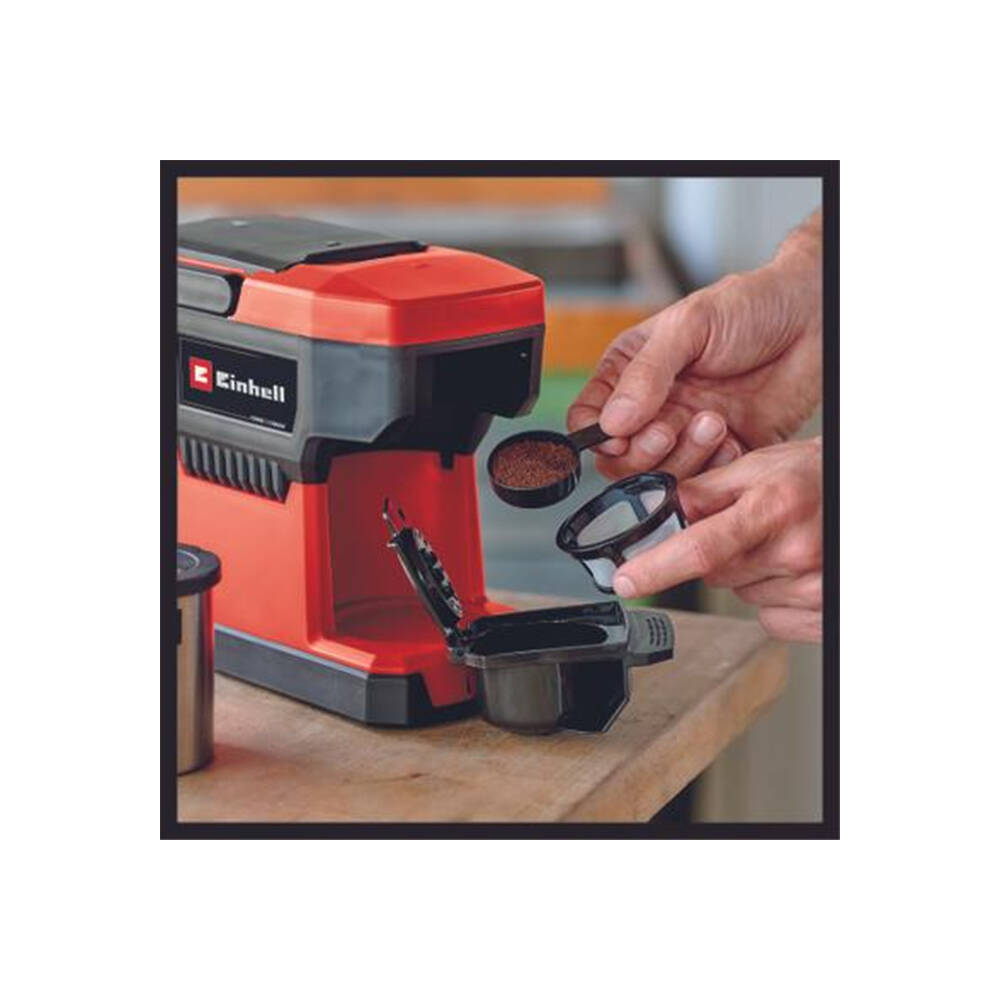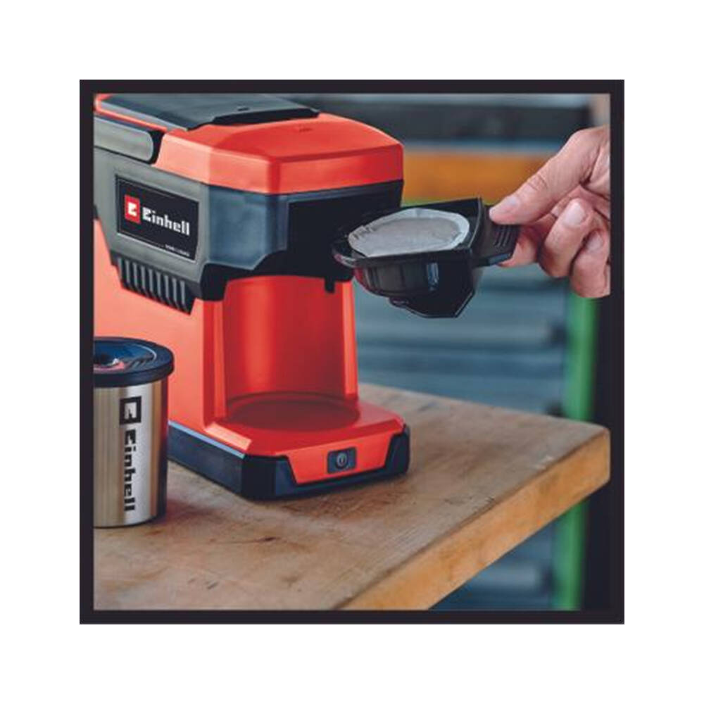 Gummifüße sorgen für rutschfesten Stand während die Tassenhalterung verhindert, dass die Tasse beim Transport herausfällt. Die Lieferung erfolgt wie bei allen Einhell Sologeräten, ohne Akku und Ladegerät. Erwerbe sie separat oder nutze deinen Akkupack-Bestand. Zum Lieferumfang gehört eine staubdichte Kaffeetasse aus Edelstahl mit Deckel. Ein Dosierlöffel, ein Kaffeepulverbehälter mit Kaffeefilter sowie Behälter für handelsübliche Kaffeepads sind in der Serienausstattung inbegriffen.
