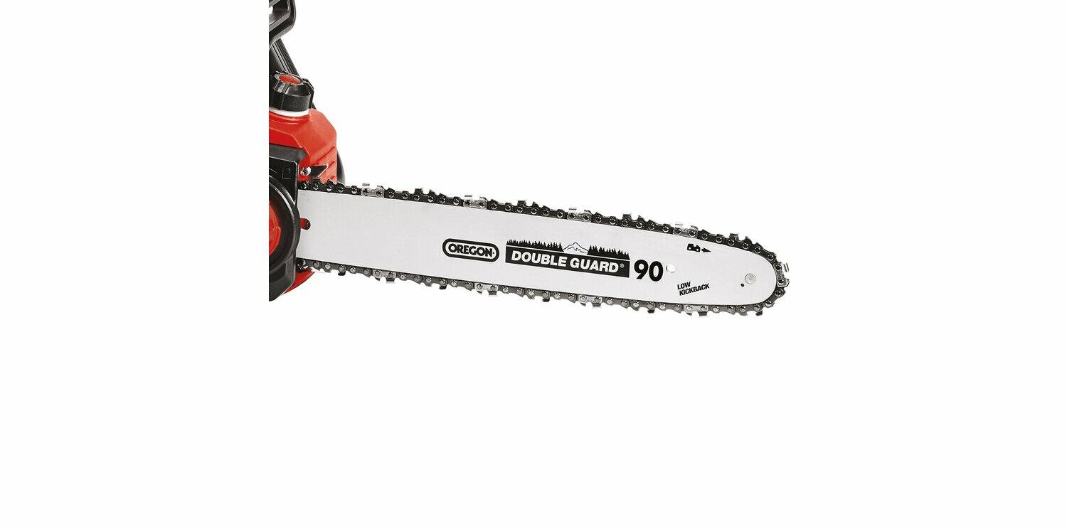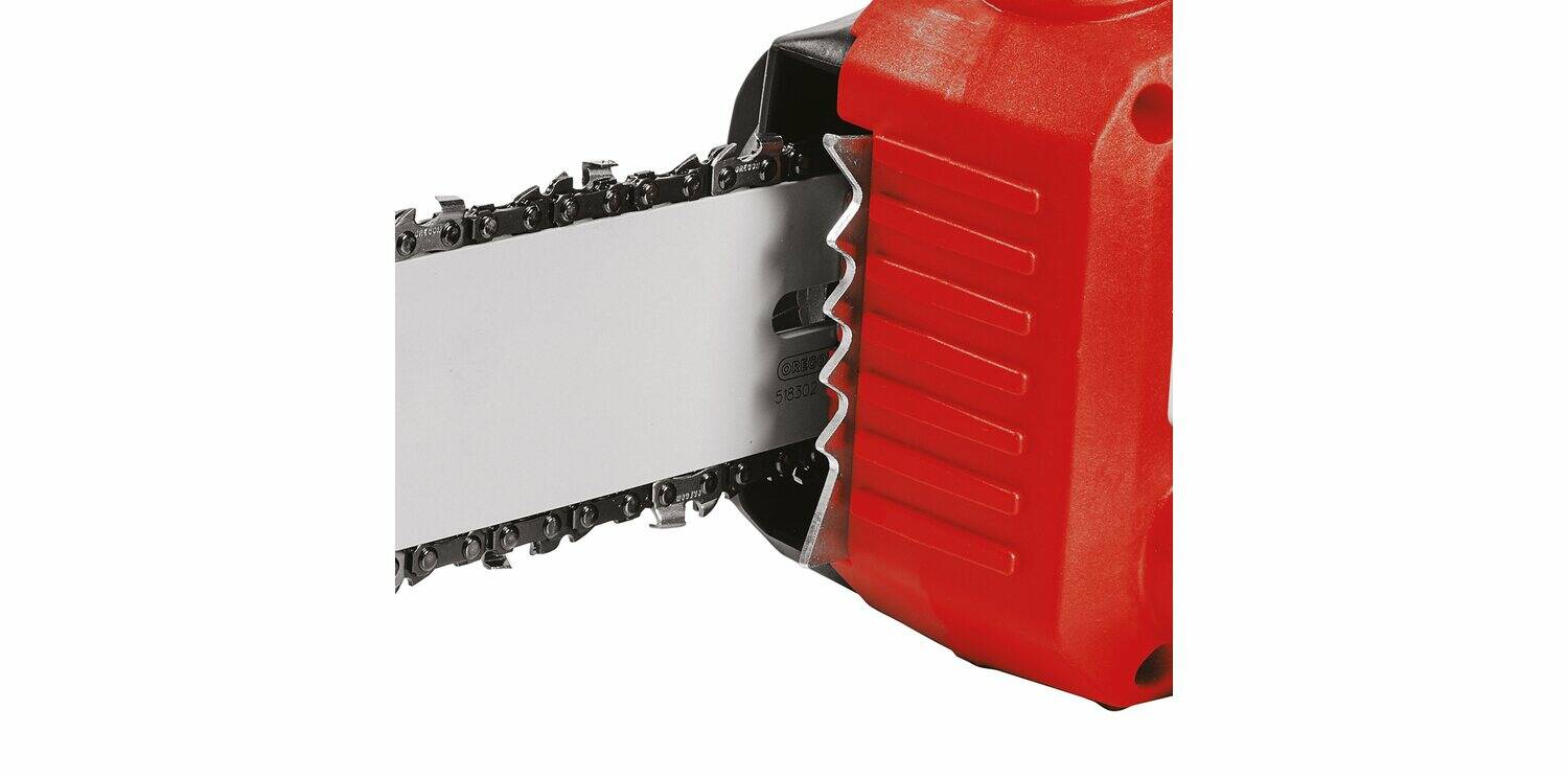 Das Herzstück der Akku-Kettensäge ist das OREGON-Qualitätsschwert mit Kette. Die Schwertlänge beträgt üppige 350 Millimeter bei einer Schnittgeschwindigkeit von 15 Metern die Sekunde. Ideal also auch für größere Baumstämme. Sowohl Kettenwechsel als auch Einstellen der Kettenspannung erfolgen bequem ohne Werkzeug. Hier denkt der traditionsreiche Werkzeughersteller Einhell mit. Zusätzliche Sicherheit erhältst dank Rückschlagschutz und einer Sofort-Kettenbremse. Dank Krallenanschlag aus Metall sowie Kettenfangbolzen hebt sich die GP-LC 36/35 Li-Solo in punkto Sicherheit auf ein professionelles Level. Die Akku-Kettensäge besitzt einen ergonomisch geformten Griff mit Softgrip. Perfekt für längere Arbeitseinsätze in deinem Garten oder harte Sessions bei widerspenstigem Material. Die Kettenschmierung erfolgt bei der GP-LC 36/35 Li-Solo automatisch. Zum Einfüllen des Öls ist eine große Öleinfüllöffnung vorhanden. Der Öltank umfasst einen Inhalt von 120 Millilitern. Die Lieferung erfolgt wie bei allen Maschinen von Einhell ohne Akku und Ladegerät. Diese sind separat erhältlich, zum Beispiel als kostengünstiges Starter-Set in verschiedenen Leistungsstufen.