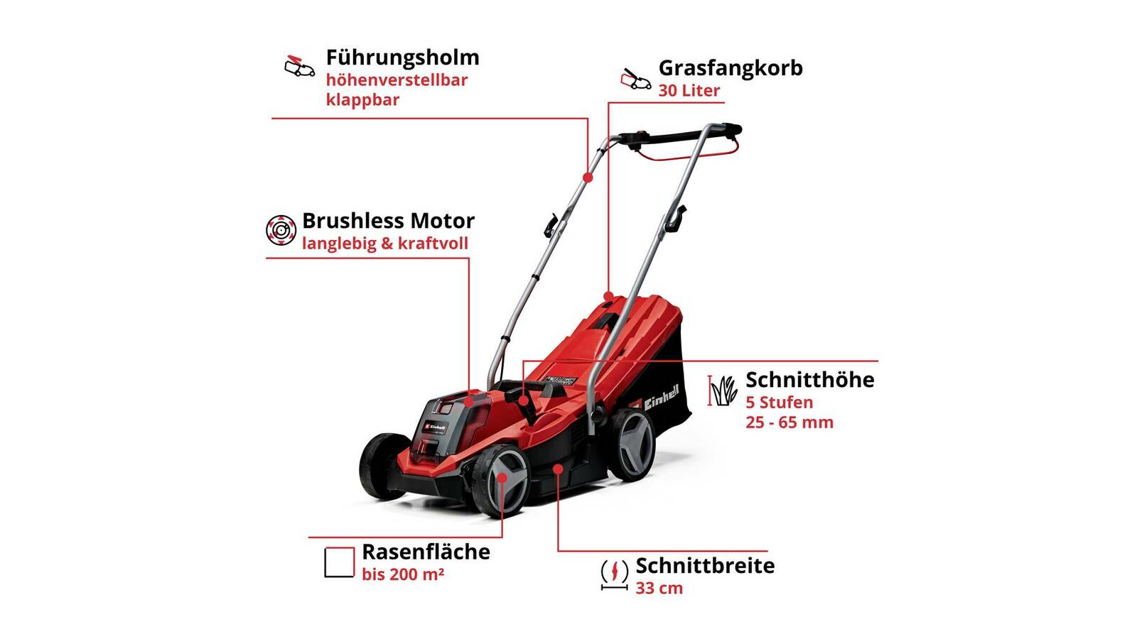 Die Energie bezieht der GE-CM 18/33 Li Akku-Rasenmäher von Einhell durch einen ausdauernden 4,0 Ampere Lithium-Ionen-Akku. Mit dieser leistungsstarken Energiequelle ausgestattet, steht der Pflege deines heimischen Grüns nichts im Weg. Du kannst dich auf eine Bearbeitung von Flächen bis zu 200 Quadratmetern verlassen. Sollte dein Garten größer sein, kannst du einfach auf größere Akkupacks zurückgreifen. So meisterst du auch umfangreichere Flächen ohne Kompromisse. Der PurePOWER Brushless-Motor ist das Herzstück im Inneren. Der Antrieb bietet maximale Leistung bei hoher Ausdauer.