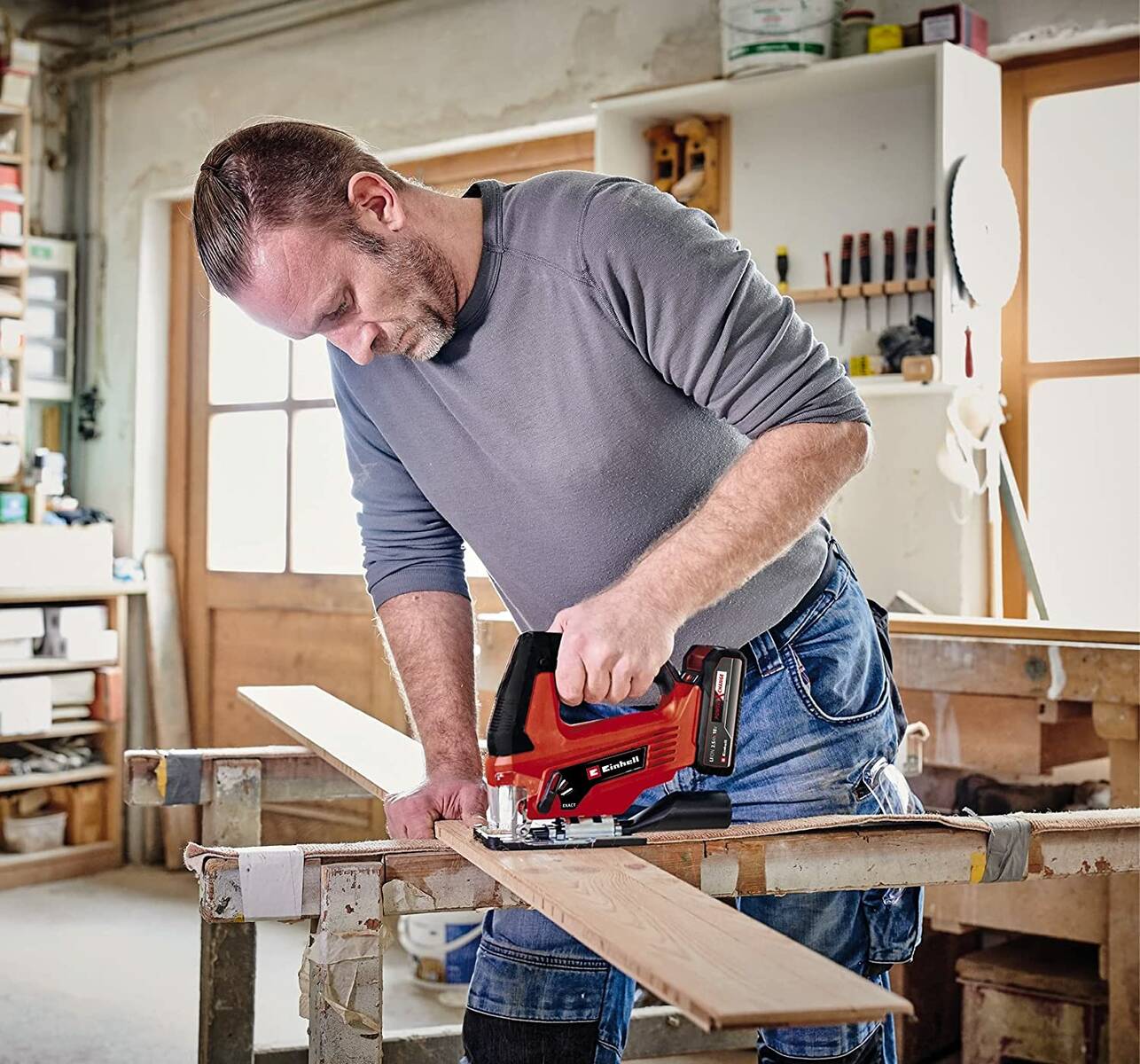 Flexibilität beim Sägen in Werkstatt und Garage. Die Einhell Akku-Stichsäge TC-JS 18 Li Solo ist immer bereit. Kabellos und kompromisslos. Das Werkzeug gehört zur Power X-Change-Familie und erfreut sich bei Heimwerkern großer Beliebtheit. Nutzen Sie Einhells 18-Volt Akkupower für unterschiedlichste Werkstoffe. Ein KWB Qualitäts-Sägeblatt für Holz befindet sich bereits im Lieferumfang. Die Säge TC-JS 18 Li Solo aus dem Hause Einhell kommt als Sologerät ohne Akku und Ladegerät. Nutzen Sie bestehende Power X-Change Akkus oder erwerben diese optional; zum Beispiel als praktisches Starterset bei uns im Shop. Sämtliche Power X-Change Batterien sind mit anderen 18 Volt Maschinen von Einhell kombinierbar. Perfekt für Anwender, welche ihr Akkumaschinen-Repertoire erweitern oder aufbauen wollen.