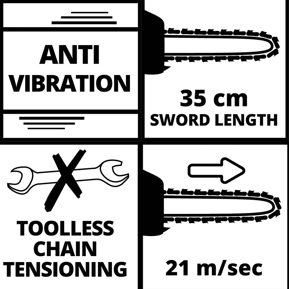Der Einhell Motor läuft ruhig, weil eine beidseitige Lagerung der Kurbelwelle dies gewährleistet. Das Anti-Vibrationssystem reduziert Vibrationen deutlich und macht längere Einsätze angenehmer. Ergonomie und Bedienbarkeit stehen im Mittelpunkt bei Einhell: Griffe liegen sicher in der Hand, Schalter und Spannmechanik erreichst du ohne großes Umgreifen. Als Benzin-Kettensäge richtet sich die Einhell GC-GC-PC 1435 TC Kit an Anwender, die auf leistungsstarke und dennoch handliche Geräte setzen. Sie bietet robuste Materialien sowie eine einfache Wartung. Praxisnahe Sicherheitsfeatures runden das Gesamtpaket ab. Nutze die Säge für Holzarbeiten rund ums Haus, beim Aufarbeiten von Gefälltem oder beim Pflegen von Wegen und Gartenflächen.