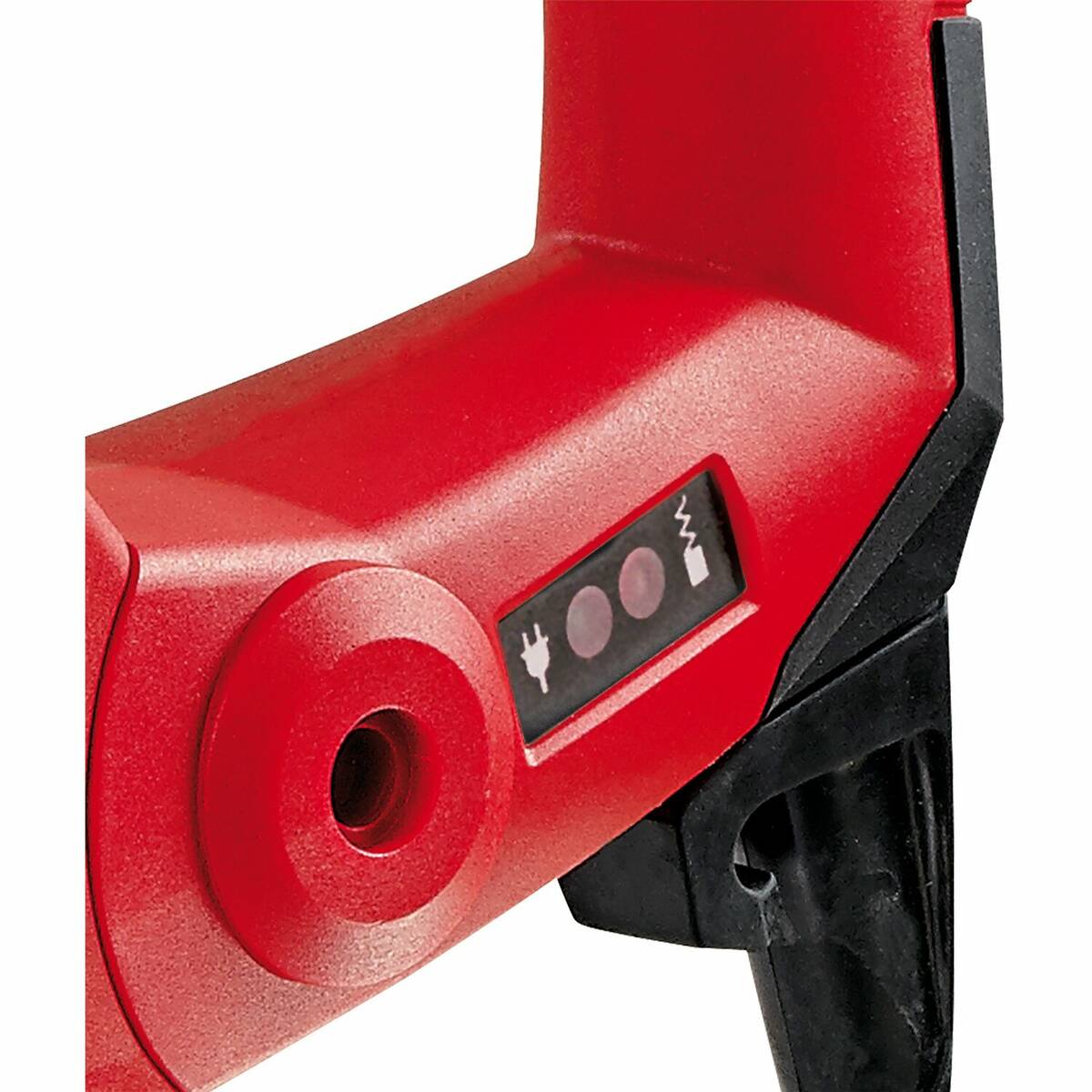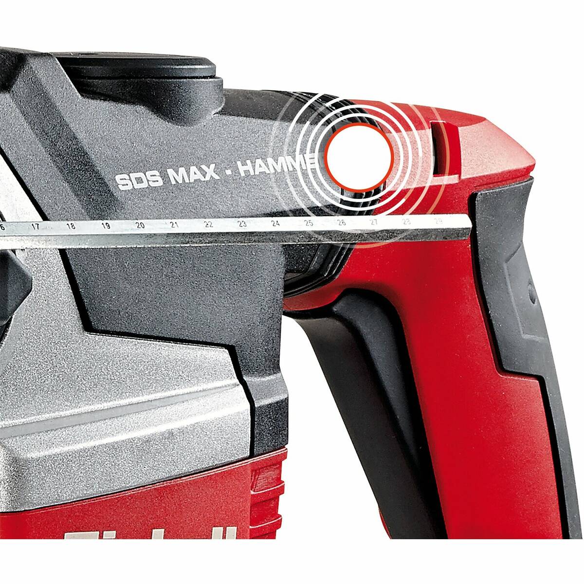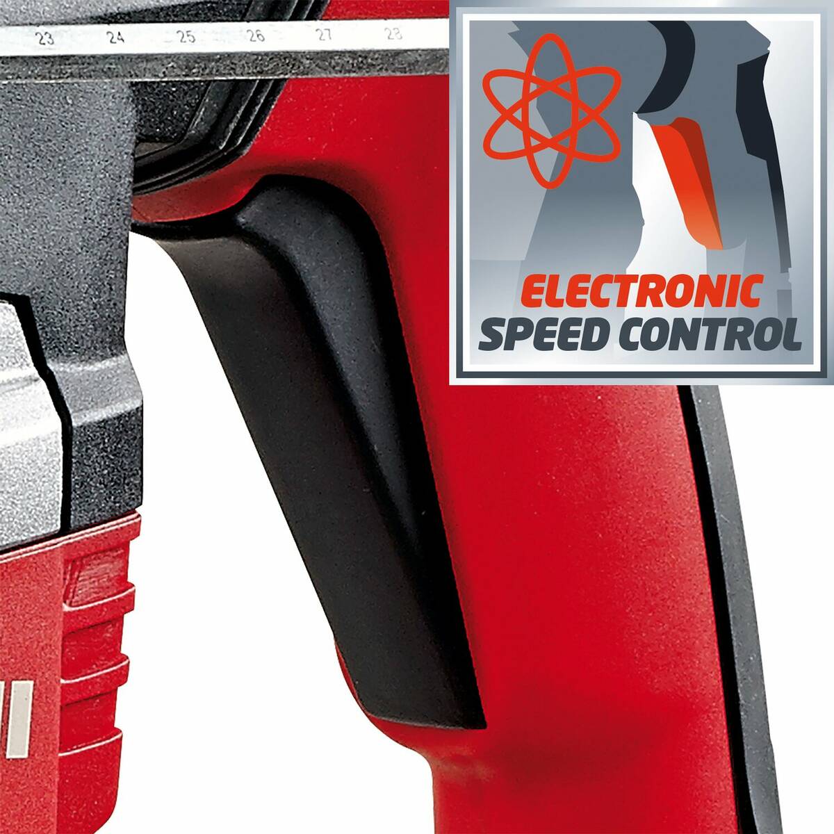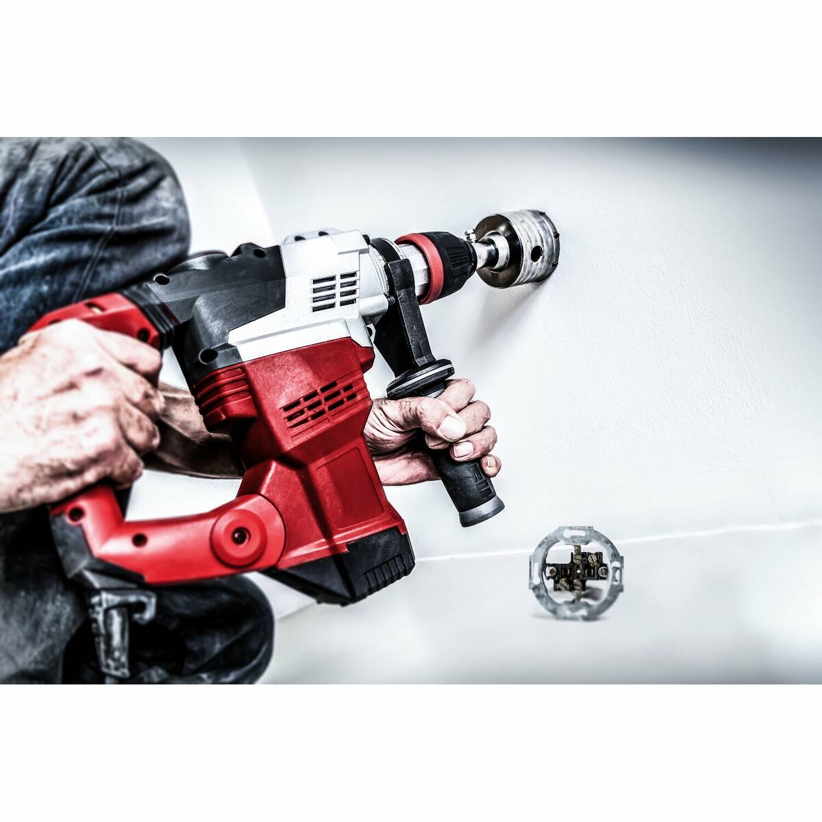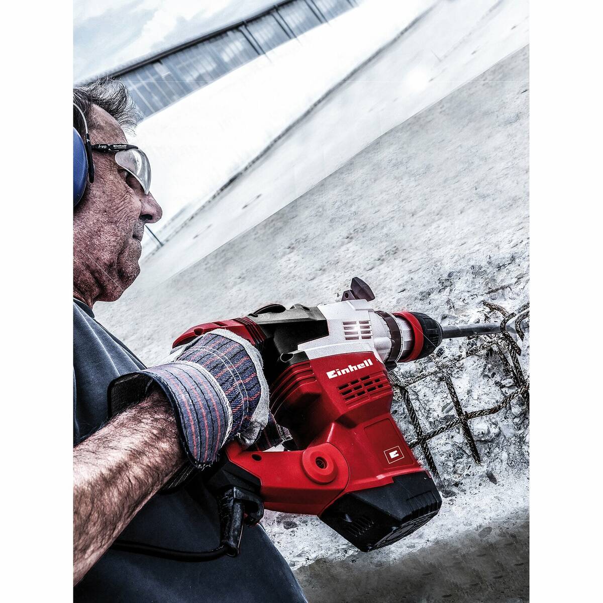 Der Einhell Bohrhammer TE-RH 38 E mit pneumatischem Schlagwerk ist ein äußerst vielseitiges Kraftpaket für den Experten, das sich bei anspruchsvollen Bau-, Renovierungs- und Stemmarbeiten unentbehrlich macht. Mit Hammerbohren sowie Meißeln mit und ohne Meißelfixierung verfügt der Alleskönner über die drei Funktionen für den universellen Einsatz. Die SDS-Max-Aufnahme ermöglicht einen schnellen, werkzeuglosen Wechsel von Bohrern und Meißeln. Der Hauptgriff des TE-RH 38 E Bohrhammers ist vibrationsgedämpft und signalisiert den optimalen Anpressdruck per Press-Control – eine wichtige Unterstützung für verschleißarmes und dennoch schnelles Arbeiten. Die zusätzlichen Softgriffeinlagen an den Handgriffen dämpfen zudem zuverlässig entstehende Schwingungen. Mittels Drehzahlelektronik lässt sich ganz einfach gefühlvoll und sanft anbohren. Der Aluminium-Getriebekopf des Bohrhammers ist robust aufgebaut. Der Zusatzhandgriff ist mittels Verrippung sicher gegen Verdrehen fixiert. Über zwei LEDs erhält man nicht nur Einsatzbereitschaft, sondern auch Servicebedarf aufgrund Bürstenverschleiß automatisch angezeigt. Für hohe Arbeitssicherheit sorgt eine Überlast-Rutschkupplung, die bei plötzlichem Bohrerklemmen sofort auslöst. Exakt wiederholbare Bohrtiefen gewährleistet der stufenlos verstellbare Bohrtiefenanschlag aus Metall. Der Bohrhammer lässt sich im Handumdrehen im praktischen Transport- und Aufbewahrungskoffer verstauen.