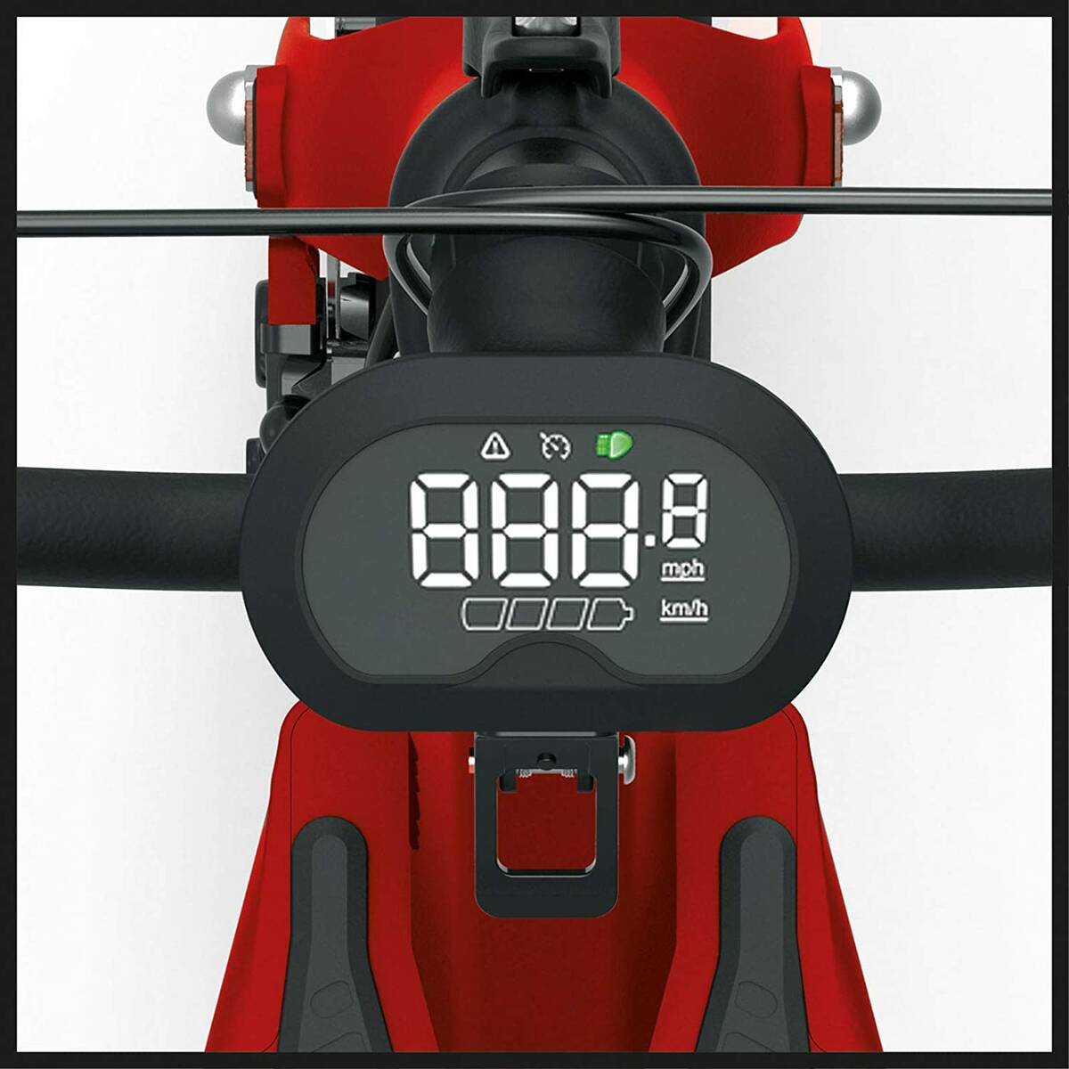 Was bietet der Einhell E-Scooter Elmoto-Kick sonst noch? Für den einfachen Transport sowie platzsparende Unterbringung lässt sich die Lenkstange klappen und einrasten. Mit verbauten Akkus wiegt der Roller unter 20 Kilogramm. Der Einhell Tretroller verfügt über ein gut ablesbares Digital-Tube LED-Display. Dieses zeigt Funktionen wie Gesamtkilometerstand, die aktuelle Geschwindigkeit oder den Status der Alarmanlage oder des Akkus an. Ebenso verfügt der E-Scooter über integrierte Hybrid-Scheibenbremsen. Denn Sicherheit geht vor bei Einhell. Wenn es einmal rasanter zugeht, sorgen die montierten Schutzbleche für stets saubere Kleidung und Schuhe. Dank großer Luftbereifung fällt nicht auf, dass der Tretroller auf eine Federung verzichtet. Die 10 Inch großen Luftreifen federn einiges weg. Selbst kleine Off-Road Abschnitte stellen für den roten Wirbelwind kein Problem dar. Wenn das Wetter umschlägt muss sich keine Sorgen gemacht werden. Der E-Scooter Elmoto-Kick C2 36 Li K ist nach IPX5 gegen Strahlwasser aus jeglicher Richtung geschützt.