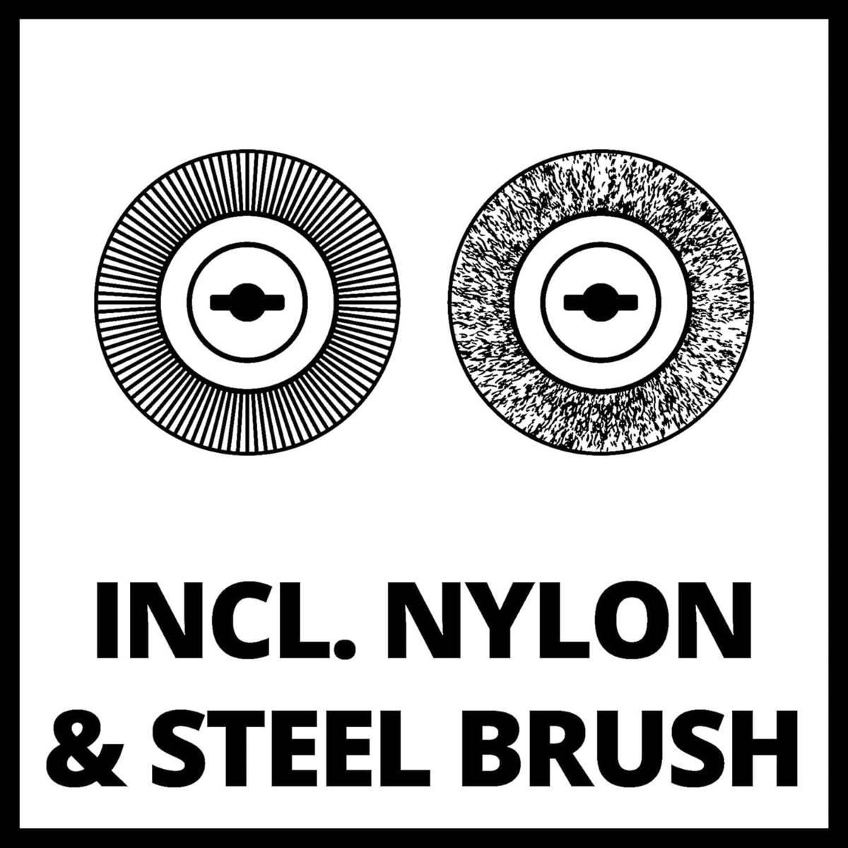 Zum Lieferumfang gehören zwei Bürstenaufsätze. Eine Stahlbürste für hartnäckigen Schmutz und eine Nylonbürste für empfindlichere Oberflächen. Beide besitzen einen Durchmesser von 100 Millimeter und lassen sich mit wenigen Handgriffen wechseln. Mit Einhell und dem Fugenreiniger GC-EG 1410 bleibst du flexibel bei verschiedenen Untergründen und Verschmutzungsgraden. Das Führungsrad am Einhell-Gerät ermöglicht dir exaktes Arbeiten entlang von Fugen. Der Bürstenschutz verhindert zusätzlich, dass Steinchen oder Schmutzpartikel hochgeschleudert werden. So bleibt dein Umfeld sauber und du selbst bestens geschützt.