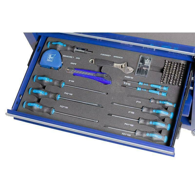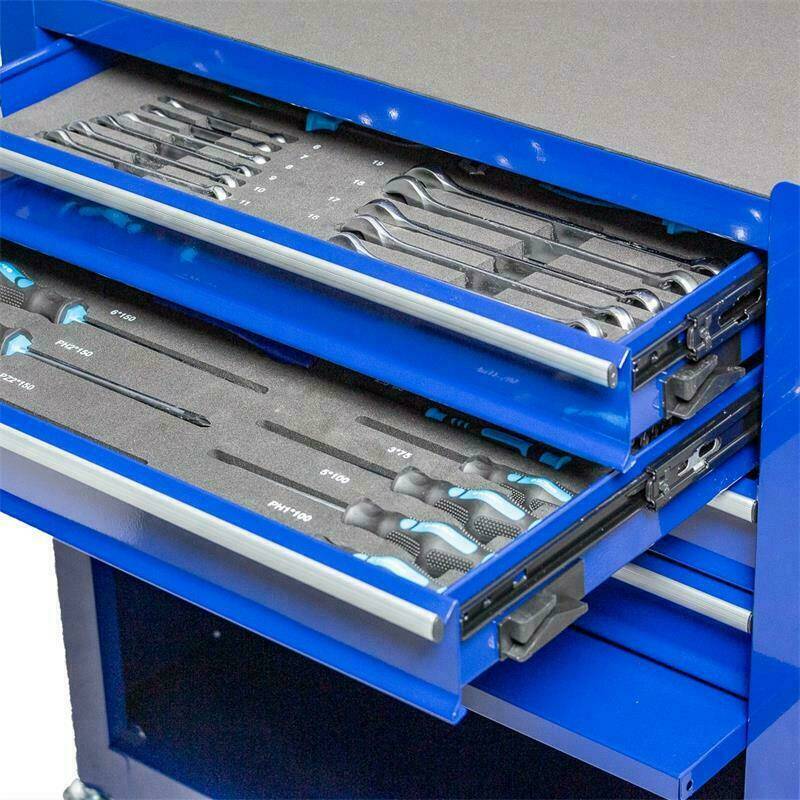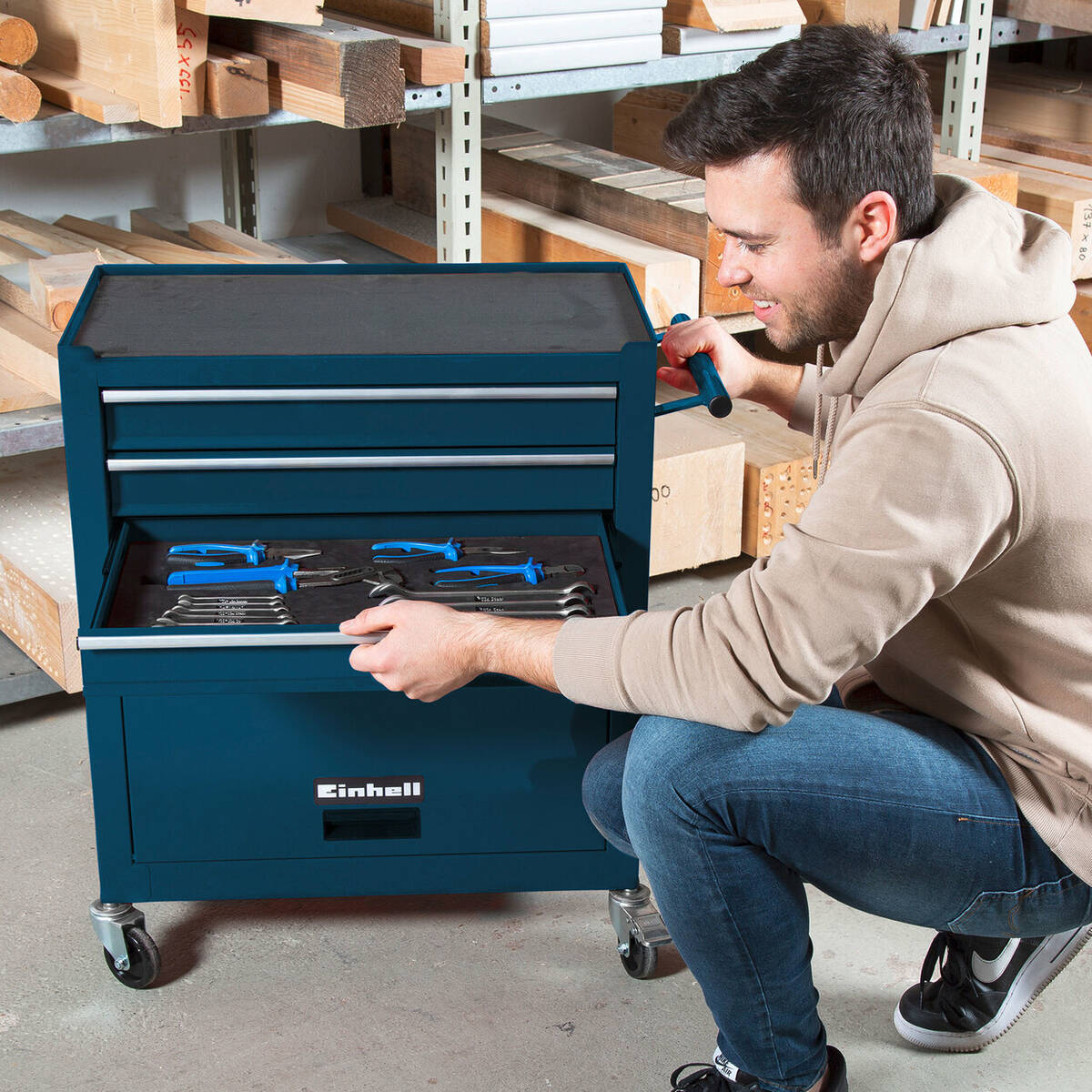 Mit deinem neuen Werkstattwagen hast du deine wichtigsten Werkzeuge alle beisammen. In den vier Schubladen ist alles übersichtlich verstaut und du hast sogar noch Platz für weitere Materialien, denn der Wagen trägt eine maximale Belastung von 75 kg. Durch die vielen verschiedenen Werkzeuge lässt sich der Wagen in unterschiedlichen Bereichen einsetzen: ob in der Werkstatt, im Hobbykeller oder deiner Garage.