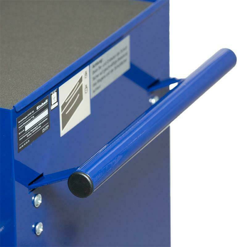 Ob du den Wagen an einen festen Platz stellst oder ihn näher zu deinen Projekten stellen möchtest, der Einhell Werkstattwagen lässt sich einfach an zwei Rollen feststellen oder mit dem Schiebegriff bewegen. Größere Maschinen finden im Ablagefach ihren Platz, welches du mit einer Klappe schließen kannst. Für noch mehr Ordnung sorgt die Ablagefläche auf dem Werkstattwagen, auf der du z. B. Werkzeuge ablegen kannst, die du gerade nicht brauchst.