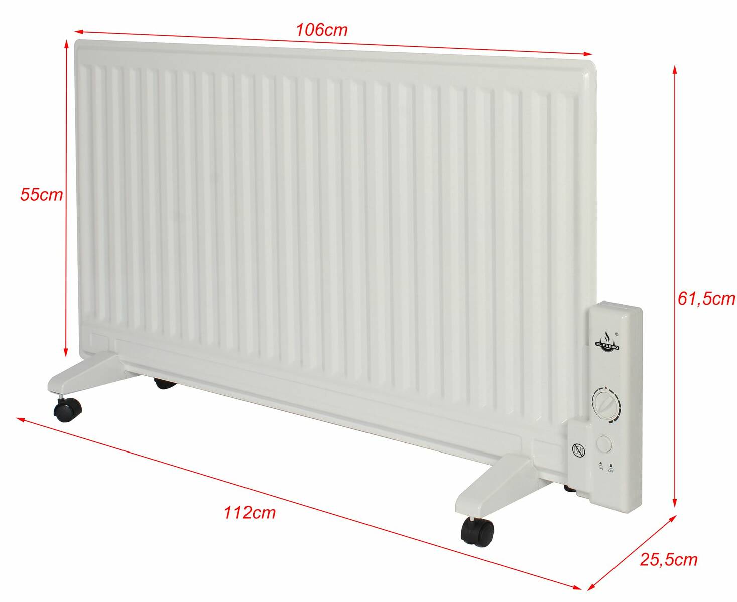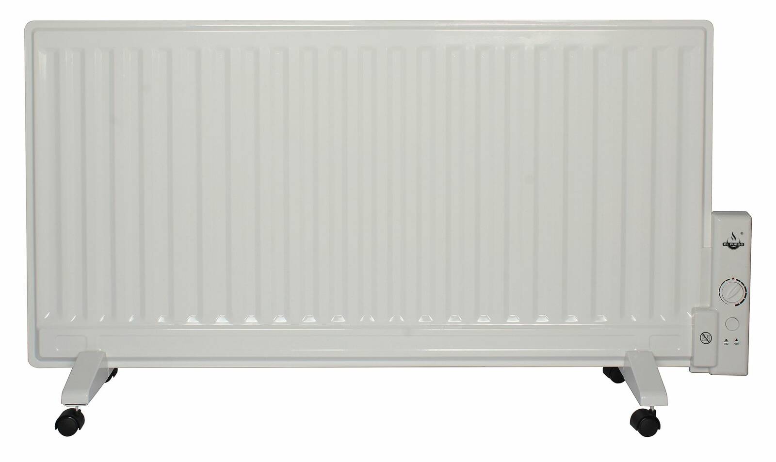 Der Öl-Panelheizer AY4964 von El Fuego punktet mit guter Wärmeabgabe sowie stabiler Bauweise. Die weiß lackierte Optik macht in Bädern und anderen Räumen mit Steckdose stets eine gute Figur. Das Material besteht aus wärmeleitendem Eisen. Im Inneren der robusten Heizung sorgt elektrischer Strom für das Erhitzen des Thermoöls. Das Modell bringt es auf eine Gesamtleistung von 1000 Watt. Mit nur 11 Kilogramm Eigengewicht bei Maßen von 112 mal 61,5 Zentimetern, eignet sich die Heizung optimal für mittelgroße Räume ohne klassischen Heizkörper. Mit transportablen Lenkrollen ausgestattet, lässt sich der Öl-Panelheizer AY4964 flexibel von A nach B bewegen. An der Seite befindet sich ein Thermostatregler für präzises Anpassen der Temperatur. Ist der Wert erreicht, hält die Heizung die Temperatur automatisch. Der Öl-Panelheizer AY4964 von El Fuego überzeugt darüber hinaus in der Kategorie Sicherheit. Das Modell verfügt über einen Kippschutz für unbeabsichtigtes Umfallen des Geräts. Des Weiteren gehört ein nützlicher Überhitzungsschutz zum Repertoire. Die Funktion aktiviert sich bei übermäßiger Beanspruchung. Mit El Fuego und dem Öl-Panelheizer AY4964 kann die kalte Jahreszeit kommen.