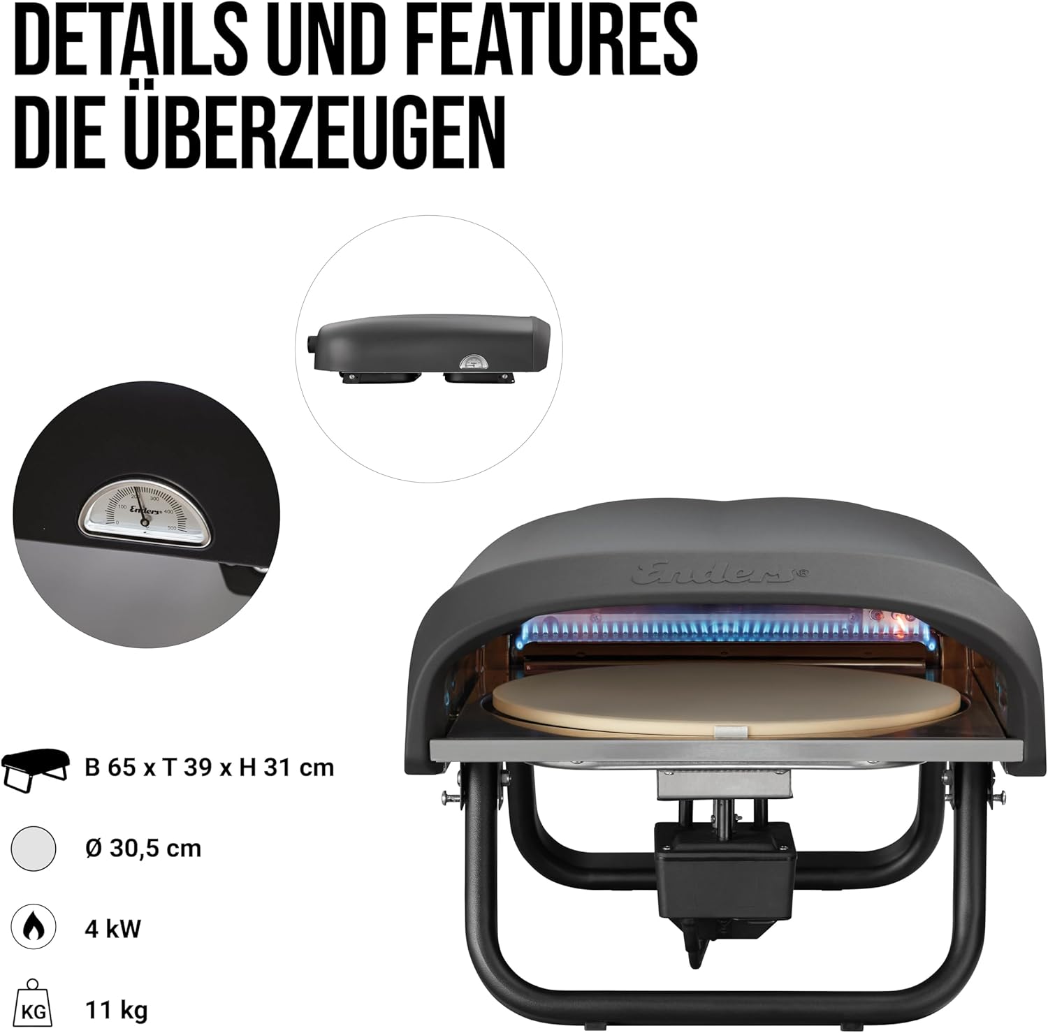 Enders legt neben Leistung und stilsicherem Design zusätzlich Wert auf die Sicherheit. Das Modell Endes Paco Rotate verfügt über eine integrierte Zündsicherung. Diese unterbricht die Gaszufuhr sofort, wenn die Flamme unerwartet erlischt. Die Beinkonstruktion lässt sich praktischerweise in Sekundenschnelle einklappen. Der Pizzaofen lässt sich anschließend für die nächste Pizza-Session transportieren. Ob beim Camping oder auf der Terrasse bei Freunden, Paco® von Enders bietet alles für ein perfektes Pizzaerlebnis. Freue dich mit der Pizzaofen-Serie auf knusprige Gerichte. Die höhere Hitze im Vergleich zu herkömmlichen Öfen sorgt dafür, dass die Pizzen nahezu die Qualität einer Profi-Pizza erreichen.