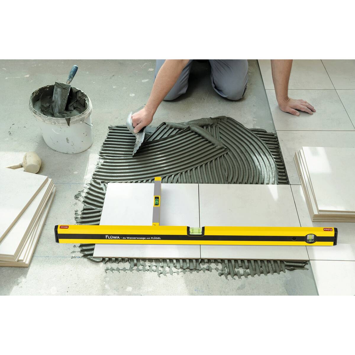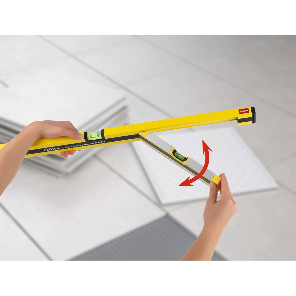 Beim umständlichen Arbeiten passiert es oft, dass eine der Wasserwaagen verrutscht – und schon beginnt das Geduldsspiel von vorn. Die FLÜWA Wasserwaage bietet hierfür eine smarte Lösung: Sie hat eine zweite Wasserwaage direkt integriert – in Form eines ausklappbaren „Flügels“! Einfach ansetzen, ausklappen, ausrichten – und schon ist alles perfekt ausbalanciert. Dank dieser durchdachten Konstruktion wird die Handhabung erheblich erleichtert, was zu noch präziseren Ergebnissen führt.