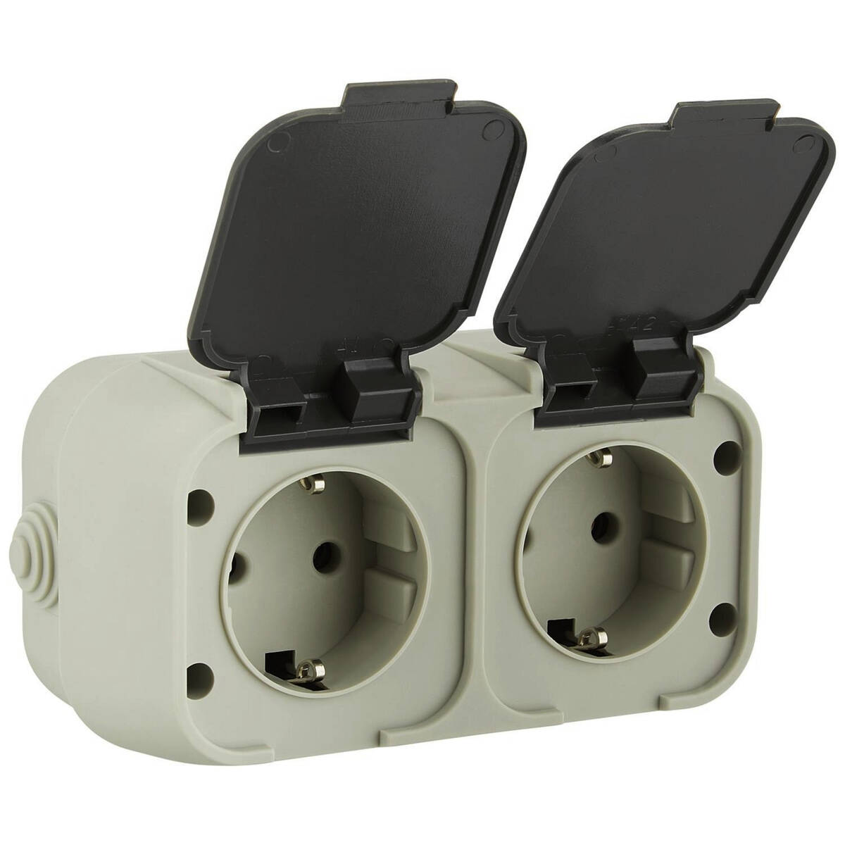 Die Go/On Doppel-Steckdose eignet sich durch Ihren IP44 Standard auch für Feuchträume und wird Aufputz montiert.