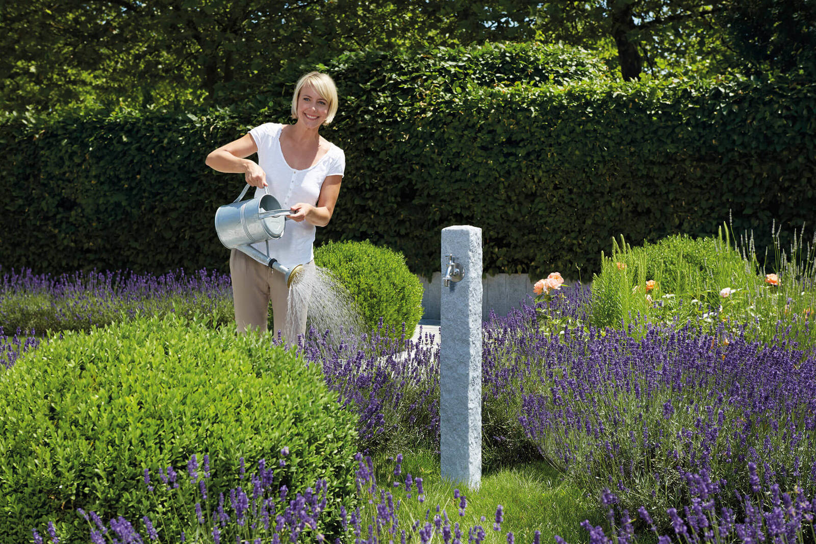 Wer kennt es nicht. Sie wollen schnell vor der Arbeit die wichtigsten Blumenkübel oder das Beet gießen. Wäre da nicht der lästige Gang in den Keller zum Wasseranschluss. Dafür fehlt leider häufig die Zeit. Zudem wird die Schlauchtrommel mühsam ab und aufgerollt. Diese Zeit ist nun vorbei. Die GRAF Zapfsäule ist ein nütztlicher Helfer & Hingucker in jedem Garten. Die stilvolle Ausführung im Farbton lightgranite, wirkt sehr natürlich und elegant. Das Material ist besonders UV- und witterungsbeständig. Zur bequemen Wasserentnahme ist ein hochwertiger Chrom-Auslaufhahn mit 139 Millimeter Durchmesser (entspricht 3/4 Zoll) im Lieferumfang enthalten. Die Montage ist kinderleicht und dank der beigelegten Aufbau & Montageanleitung zügig erledigt. Im Sockel der GRAF Wasserzapfsäule 356026 sind bereits Bohrungen enthalten. Mit einer Höhe von einem Meter sowie einer Breite/Höhe von 13 Zentimetern, ist das Modell äußerst kompakt. Es drängt sich nicht auffällig in den Vordergrund. Tipp: Bodentank separat erhältlich. GRAF Wasserzapfsäule Granit, bietet eine ideale Ergänzung zu den Komplettpaketen » Garten « und Komplettpaketen » Haus «.