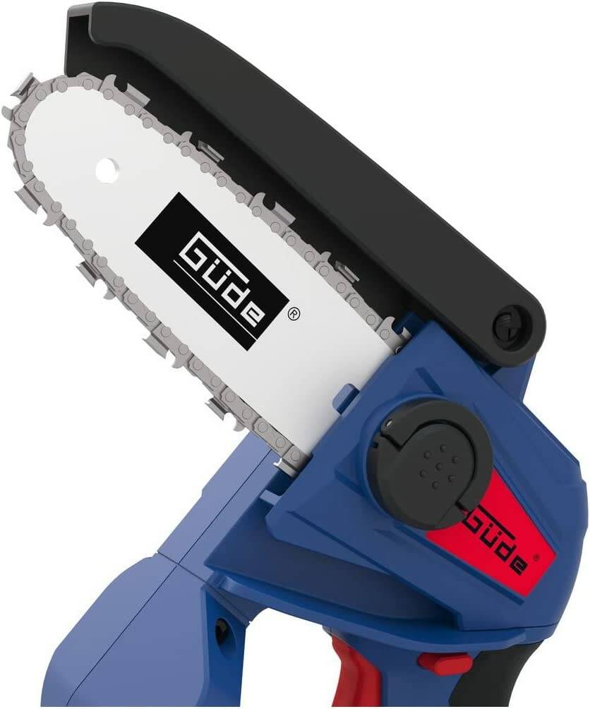 Die Güde Akku-Minikettensäge MK 18-201-05 ist ein praktisches Gartenwerkzeug aus der 18 Volt E³ Akkusystem-Gruppe. Mit der Möglichkeit des schnellen Wechselns von Kette und Schwert mittels Spannschlüssel sowie einer hochwertigen Schneidgarnitur, punktet die Güde Säge als Helfer für die Gehölzpflege im Garten. Mache sagen, die Maschine gelte eher als Akku-Astsäge. Entscheiden Sie selbst! Für die Anwender-Sicherheit sorgen der Ketten-Sicherheitsschutz sowie der Sicherheitsschalter. Mit dem Schwertschutz lässt sich die Güde Akku-Minikettensäge sicher aufbewahren.