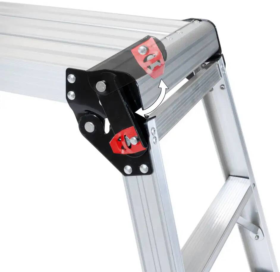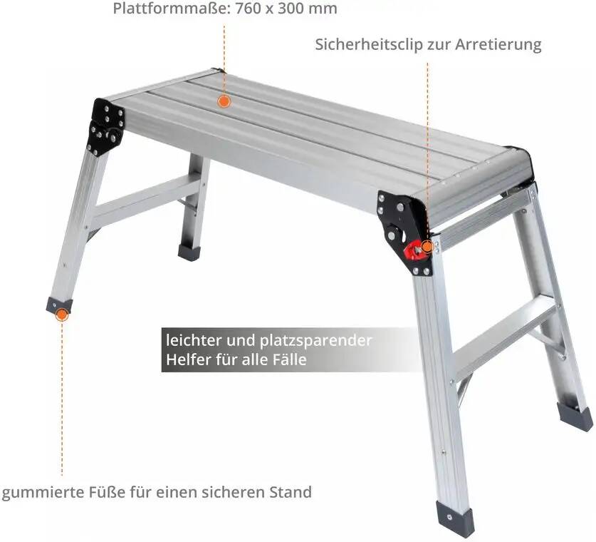 Mit der Aluminium Arbeitsplattform GAAP 760 von Güde hast du einen stabilen Helfer an der Hand. Die praktische Multi-Leiter eignet sich für viele Aufgaben rund ums Haus und Baustelle. Ob Montieren, Renovieren oder Dekorieren. Einsatzmöglichkeiten finden sich immer. Schnell zusammengeklappt lässt sich die GAAP 760 sicher und platzsparend verstauen. Die maximale Belastung kann sich sehen lassen. Güde gibt in den technischen Daten 150 Kilogramm an. Die Maße der Aluminium Arbeitsplattform von Güde betragen 760 mal 300 Millimeter. Die GAAP 760 verfügt über einen speziellen Clip zur Arretierung im ausgeklappten Zustand. Sicherheit geht bei Güde vor. Gummierte Füße erhöhen die Standsicherheit des Tritts bei der Nutzung. Freue dich auf robusten Allrounder für Zuhause oder die Baustelle. Mit unter vier Kilogramm Eigengewicht nimmst du den flexibelen Bauhelfer überall mit hin.