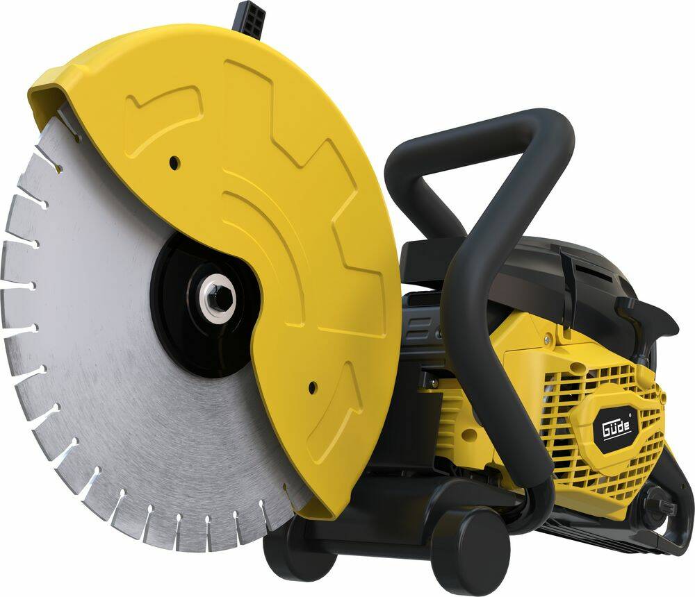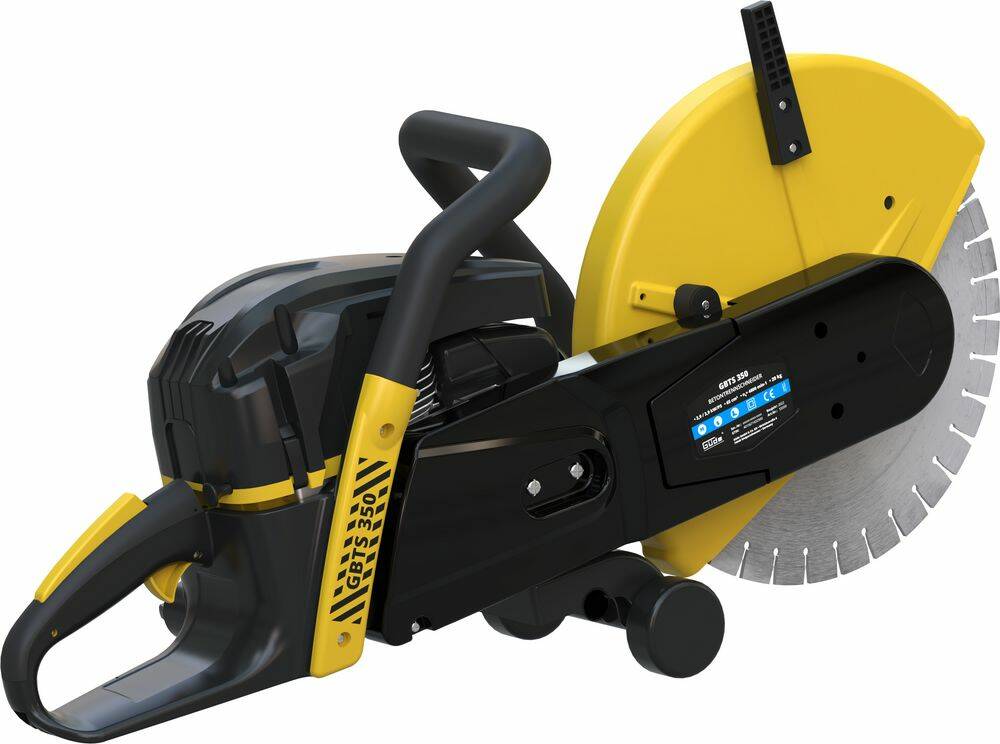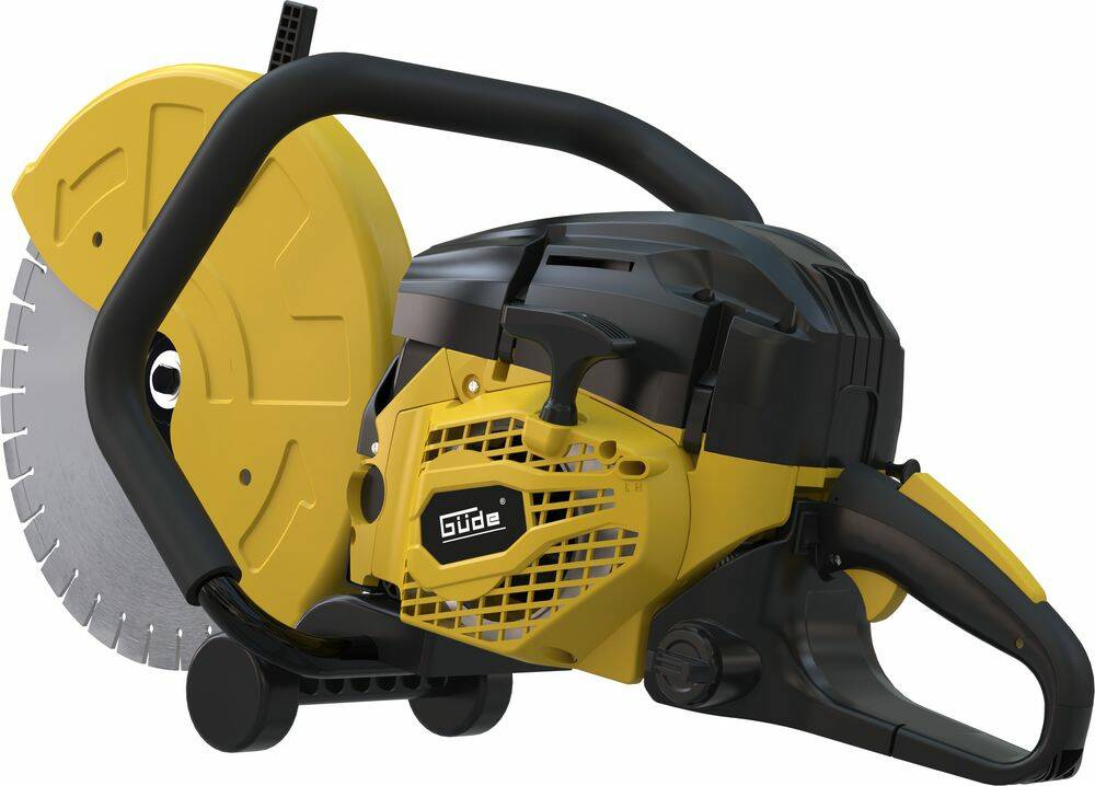 Der Betontrennschneider GBTS 350 von Güde gehört als Must-Have Maschine auf jede Baustelle. Ein 3,9 PS starker sowie luftgekühlter Zweitakt-Motor treibt die Baumaschine an. Den Hubraum gibt Güde mit 65 Kubikzentimeter an. Im Lieferumfang des GBTS 350 befindet sich bereits eine hochwertige Diamanttrennscheibe. Der Scheibendurchmesser bei diesem Modell beträgt 350 Millimeter. Es lassen sich Schnitttiefen von maximal 130 Millimeter erreichen. Der Güde Betontrennschneider GBTS 350 funktioniert sowohl im Nass- als auch im Trockenschnittverfahren. So bleibt der Anwender stets flexibel. Eine Schlauchkupplung für Gartenschläuche für den Nassschnitt liegt dem Set bei. Zusätzlich gehören drei Ersatzluftfilter mit zur Serienausstattung. Der GBTS 350 verfügt außerdem über Ventile am Sägeblatt. Dort lässt sich der Wasserdruck des angeschlossenen Schlauchs mühelos regulieren. Güde denkt mit! Der Betontrennschneider eignet sich für viele Einsatzgebiete. Hierzu zählen vor allem Betonflächen auffräsen oder Rand- und Tiefbordsteine kürzen. Ebenso lassen sich kompromisslos Pflaster- und Knochensteine mit dem GBTS 350 zertrennen. Mit 16 Kilogramm Eigengewicht ist die Maschine angenehm zu bedienen. Bitte verwenden Sie ausschließlich 2-Takt Motoröl für den Betrieb. Hier eignen sich JASO FC / ISO EGC. Ein Reversierstart dient als Startsystem des GBTS 350. Anwerfen und loslegen.