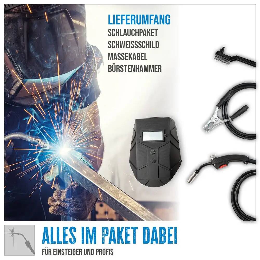 Direkt einsatzbereit dank großem Lieferumfang: Ein angeschlossenes Schlauchpaket mit Masseklemme und Bürstenhammer sind mit an Bord. Ein Schweißschild, 0,45 Kilogramm Schweißdraht sowie drei Ersatzdüsen sind bei Güde Serie. Abgerundet wird das üppige Set mit einer Ersatzvorschubrolle (0,9 Millimeter).