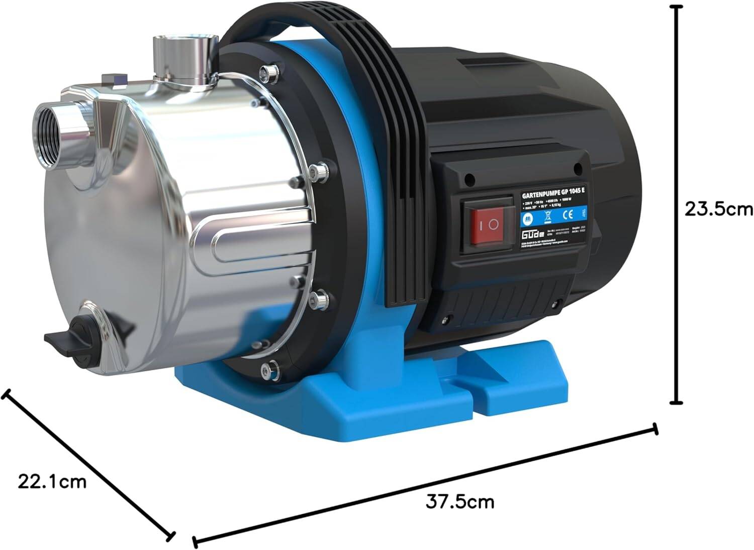 Mit der Güde Gartenpumpe GP 1045 E startest du in die Saison! Hol dir einen Allrounder in Sachen Pumpen in den Garten! Im Detail fällt auf, dass die GP 1045 sowohl inneren als auch äußeren Bereich zu überzeugen weiß. Güde legt großen Wert auf Effizienz und Komfort in der Bedienung. Das Gehäuse der Gartenpumpe besteht aus widerstandsfähigem Edelstahl. Gerade im Outdoorbereich eine gute Wahl wie wir finden. Ein Laufrad aus Noryl sorgt im Inneren für Aufsehen. NORYL-Harze bieten ein ausgewogenes Verhältnis von mechanischen & chemischen Eigenschaften. Zudem verfügt das Modell GP 1045 E über eine Schraube für den Wasserablass und das Entlüften. Ein frustfreies Benutzen der Pumpe ist bei diesem Modell nahezu garantiert! Das Warten vereinfacht Güde mit der Schraube ebenfalls um ein Vielfaches. Güde stattet die Gartenpumpe mit einer speziellen Dichtung aus, damit sie lange sicher arbeitet. Dank des ergonomischen Tragegriffs bugsierst du die Pumpe in wenigen Sekunden von einem Einsatzort zum nächsten.