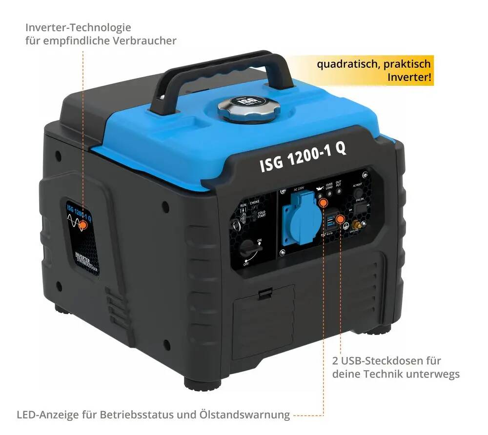 Häufig verzichten Anwender in der heutigen Zeit ungern auf technische Begleiter wie Handy und Co. Hier setzt der Güde ISG 1200-1 Q dank Inverter-Technik an. Mögliche Einsatzgebiete wie Camping oder das Verwenden auf Baustellen sind nur zwei Beispiele, welche wir an dieser Stelle nennen möchten. Güde nutzt bei diesem Modell einen kraftvollen 4-Takt-OHV-Benzinmotor mit Reversierstarter. Der ISG 1200-1 Q lässt sich dank mechanischer Seilzug-Startvorrichtung ruckzuck starten. Perfekt für kleinere Verbrennungsmotoren in diesem Genre. Ob Zeltplatz, Garten oder Festivalgelände, danke seiner kompakten Maße und vergleichbar geringem Gewicht ist der ISG Stromer sehr mobil. Zwei USB-Anschlüsse sorgen für flexible Anschlussmöglichkeiten für Mobilgeräte oder Soundsysteme. Ein übersichtliches LED-Display informiert dich stets über den Betriebsstatus und warnt zudem vor einem niedrigen Ölstand. Zusätzlich bietet der ISG 1200-1 Q Inverter Stromerzeuger von Güde eine automatische Abschaltung bei Überlastung. Eine Ölmangelsicherung rundet das Gesamtpaket in puncto Sicherheit ab. Rutschhemmende Füße sorgen für einen stabilen Stand. Zeitgleich dämpfen Sie bauartbedingte Vibrationen während des Betriebs. Das subjektiv gesehen geringe Gewicht dient einem leichteren Transport von A nach B. Laut technischem Daten kommt der quadratische Würfel auf 12,4 Kilogramm Eigengewicht.