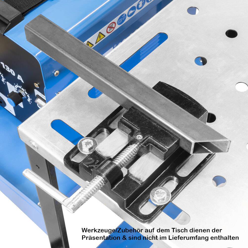 Der mobile Schweißtisch MST 915 plus von Güde ermöglicht einen flexiblen Einsatz in Garage oder Werkstatt. Die lasergeschnittene Tischfläche punktet mit 16 Millimeter-Löchern für Schweißklemmen. Diese sorgen für optimierte Fixierung des Schweißguts. Zur Befestigung von Winkelklemmen sowie Schraubstöcken gehören Langlöcher mit zur Ausstattung. Des Weiteren überzeugt der Güde MST 915 plus durch seine Mobilität und den sicheren Stand. Vier integrierte Lenkrollen in robuster Ausführung runden das Modell ab. An der Seite des Tisches lassen sich Schweißgerätekonsole und Elektrodenhalter beziehungsweise Brennerhalter oder Werkzeugleiste platzieren. Hier denkt Güde durch praktische Einhängeösen mit. Zur sicheren Aufbewahrung lassen sich relevante Teile stets schnell greifen. So bietet das großzügige Ablagefach unter dem Schweißtisch genügend Platz für essenzielles Zubehör. Es sorgt zusätzlich für Ordnung und Übersicht. Das im Lieferumfang enthaltene Schweißmagneten-Set ermöglicht sicheres Positionieren und Fixieren beim Heften des Schweißgutes. Erwähnenswert: Der mobile Schweißtisch MST 915 plus von Güde meistert Traglasten bis zu 300 Kilogramm. Schwere Werkstücke sind somit problemlos bearbeitbar.