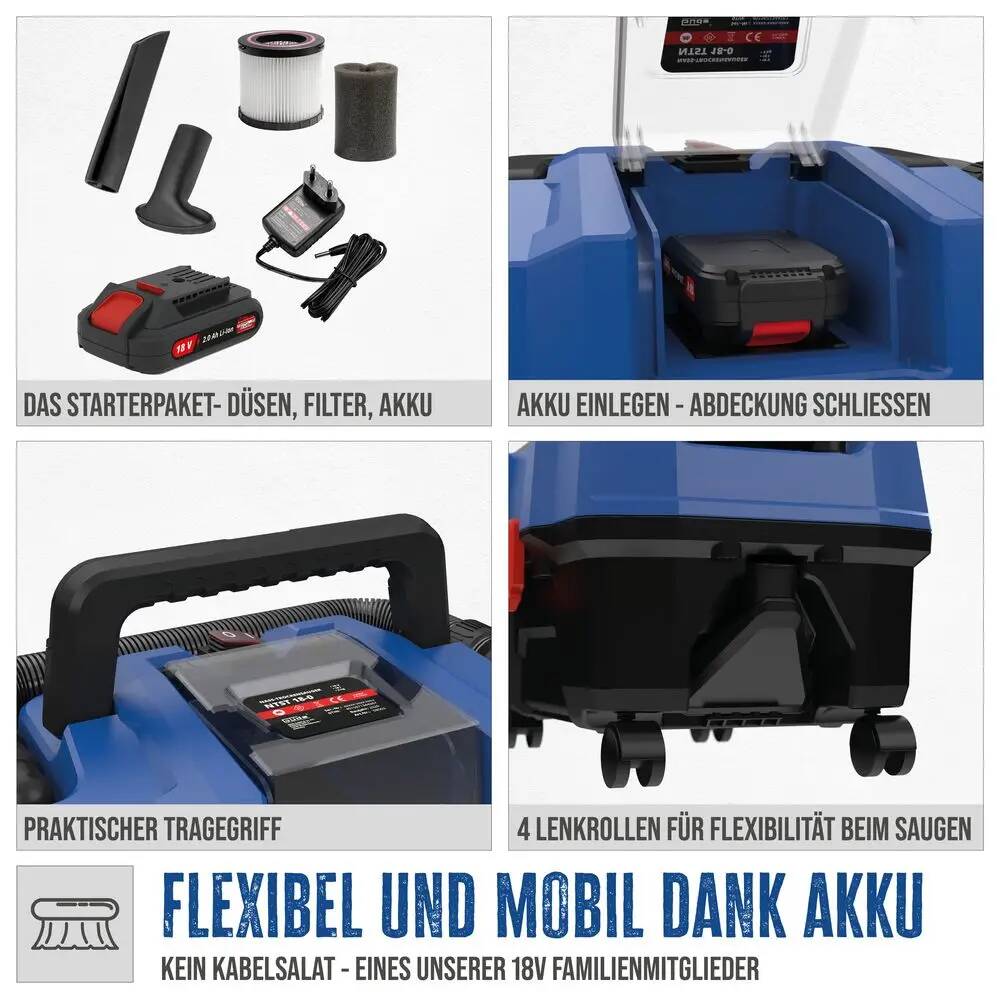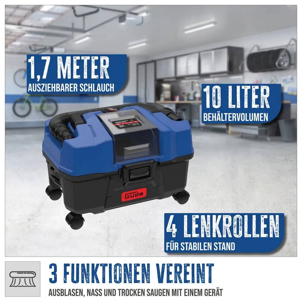 Der Güde NTST 18-201-05 Nass- und Trockensauger arbeitet kabellos mit dem 18 Volt E³ Akkusystem. So eignet sich der Güde Sauger ideal für Haus, Garage oder Terrasse. Er benötigt keine Steckdose und bietet damit viel Bewegungsfreiheit. Der Nass- und Trockensauger saugt nicht nur Flüssigkeiten und trockene Rückstände auf, sondern bläst auch groben Schmutz aus den Ecken. Das Gerät bietet drei Funktionen: Nasssaugen, Trockensaugen und Ausblasen. Der Güde Nass- und Trockensauger erzeugt bis zu neun Kilopascal Unterdruck und reinigt damit äußerst gründlich. Der zehn Liter große Behälter nimmt dabei ausreichend Schmutz auf.