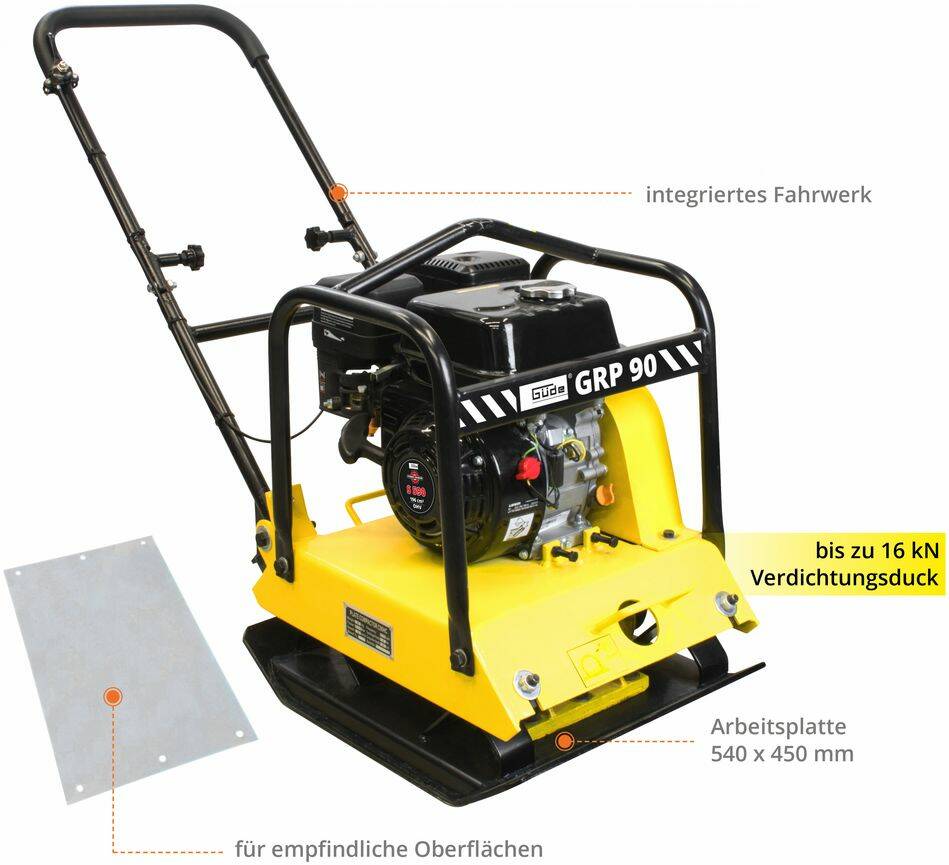 Die Güde GRP 90 Rüttelplatte ist die ideale Maschine für Pflaster- und Ausbesserungsarbeiten. Ganz egal ob für Heimwerker oder Profi. Ebnen Sie lose Untergründe mit Leichtigkeit. Der leistungsstarke 4-Takt Motor kommt auf 4,1 Kilowatt - umgerechnet 5,5 Pferdestärken. Der Verdichtungsdruck liegt laut technischen Datenblatt bei 16 Kilonewton. Daraus resultiert eine ansehnliche Verdichtungstiefe von 35 Zentimetern im laufenden Betrieb. Die GRP 90 eignet sich sowohl für kleinere als auch mittelgroße Flächen. Durch seine im Lieferumfang bereits enthaltenen Transporträder, gelingt ein müheloses Bewegen von Baustelle zu Baustelle. Auch an den Bedienkomfort denkt Güde. So sorgt der automatische Vorlauf für mehr Komfort im Betrieb. Darüber hinaus verfügt die Rüttelplatte über eine nützliche Ölmangelsicherung. Widerstandsfähig und verwindungssteif. Diese beiden Merkmale treffen auf die verschleißfreie Basisplatte zu. Selbige arbeitet dauerhaft in direktem Kontakt zum Gestein. Sie muss dementsprechend mächtig was aushalten. Dauert ein Arbeitseinsatz länger an, kann es durch Vibrationen der Maschine zu Ermüdungserscheinungen kommen. Hier schafft der gepolsterte Handgriff Abhilfe. Selbiger lässt sich zudem zum einfachen Verstauen & Transportieren einklappen. Praktisch! Ein Fahrwerk gehört ebenso zur Grundausstattung der GRP-Maschinen.