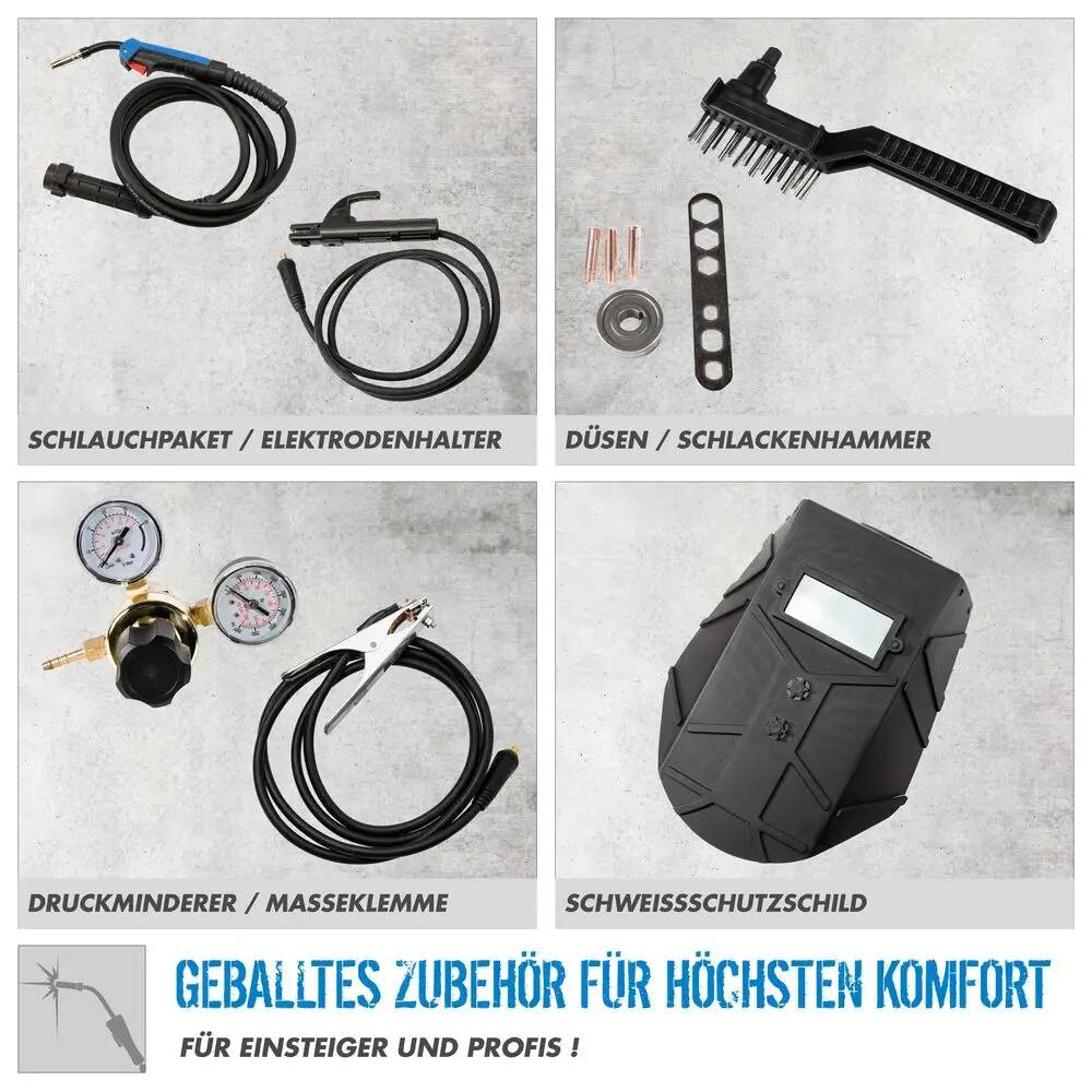 Mit dem Uni-Mig 205 SYN lassen sich praktisch alle vier Schweißverfahren mit einem Gerät durchführen. MIG-MAG, MMA (Elektrodenschweißen), Flux (Fülldrahtschweißen) sowie optional WIG-Schweißen. IGBT unterstützte Inverter-Technology sorgt für extrem schnelle Schaltprozesse und präziser Schweißstrom-Regulierung. Letzteres vereinfacht Schweißen von dünneren Blechen und reduziert die Schweißperlenbildung signifikant. Zusatzeigenschaften wie Anti-Stick, Hot Start und Arc Force, sorgen für maximalen Schweißkomfort, selbst unter schwierigen Bedingungen. Das Güde Universalschweissgerät Uni-Mig 205 SYN verfügt über einen synergic-geregelte Drahtvorschub. Die Software stellt sich nach Auswahl von Schweißverfahren, Drahtstärke sowie Schweißstärke automatisch auf die entsprechende Geschwindigkeit ein. Vor allem Einsteigern ermöglichen die Zusatzfunktionen sofort top Schweißergebnisse. Das Uni-Mig 205 SYN von Güde punktet mit einem üppigen Zubehörangebot. Elektrodenhalter, Masseklemme, sowie das Schweißschild sind serienmäßig im Lieferumfang enthalten. Gleiches gilt für den MIG-MAG-Brenner und den Druckregler. Der ebenfalls im Lieferumfang enthaltene Schweißwagen sorgt für Ordnung und größtmögliche Mobilität. Er rundet das All-in-one Set ab. So kannst du direkt durchstarten. Egal ob Profi oder Schweißer-Neuling.