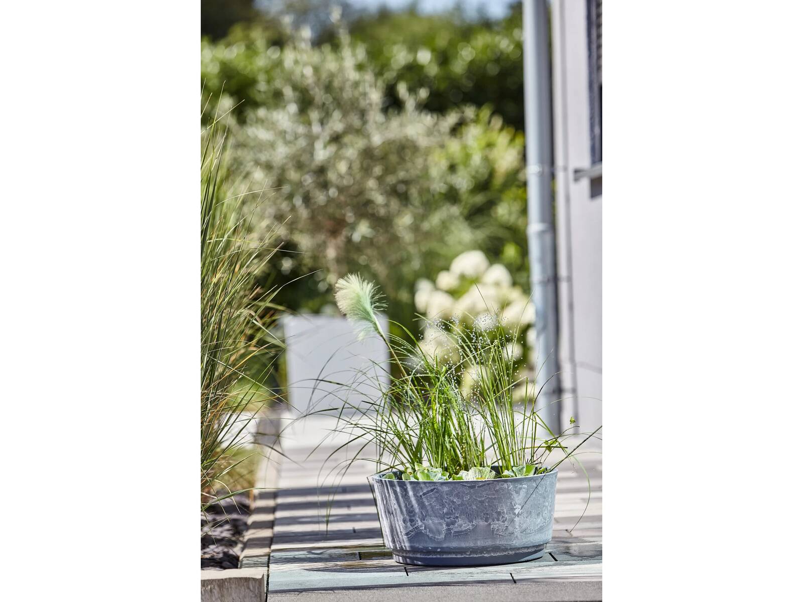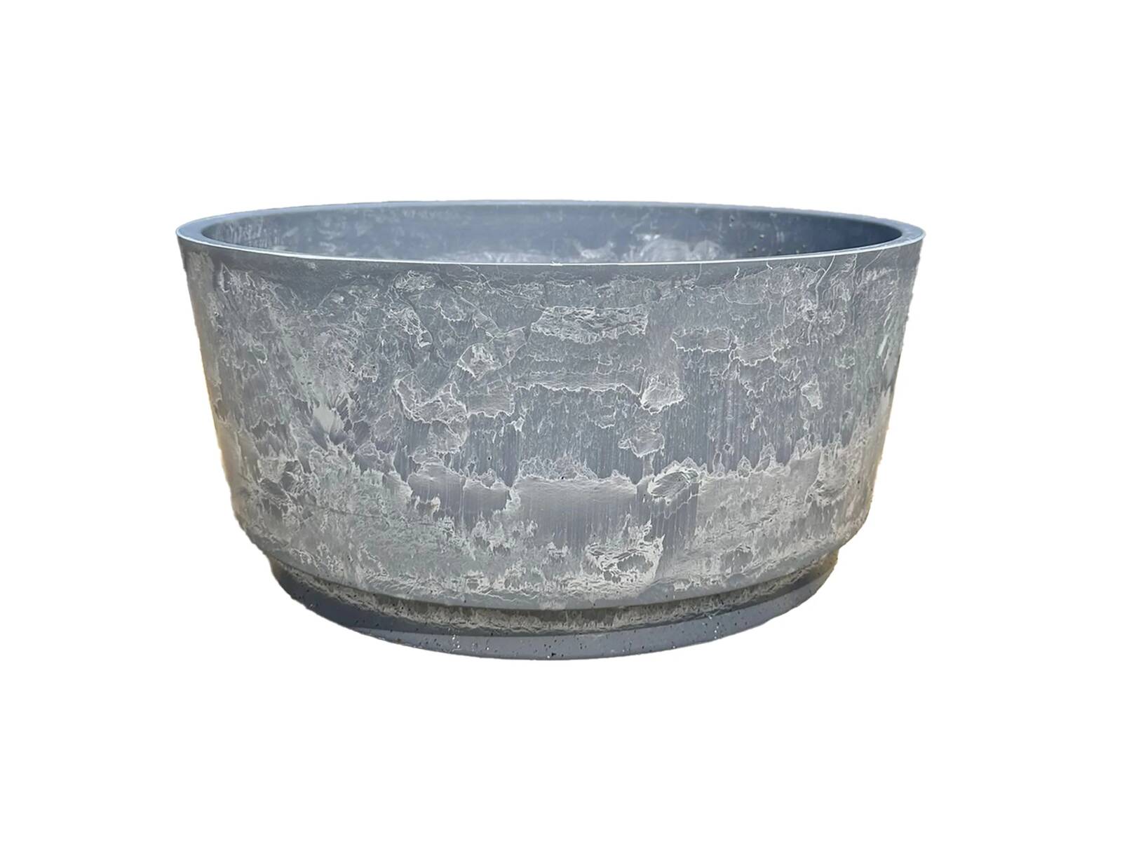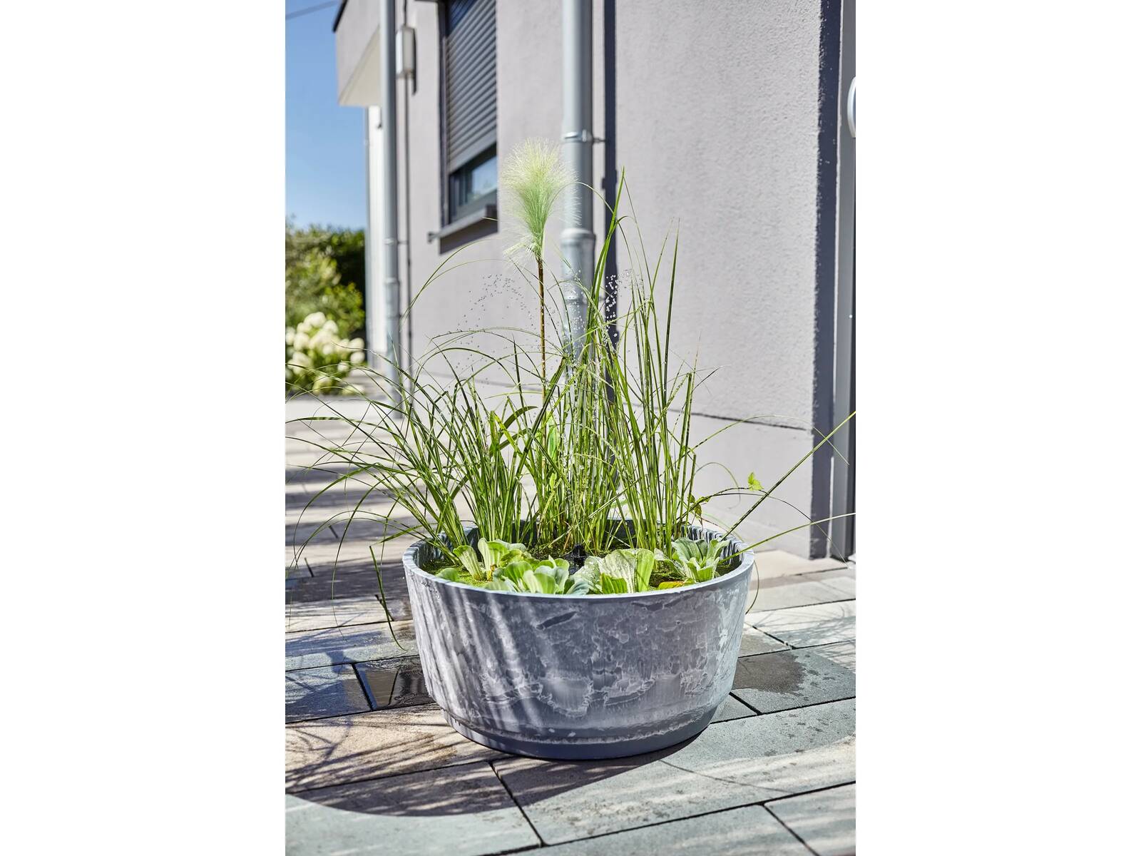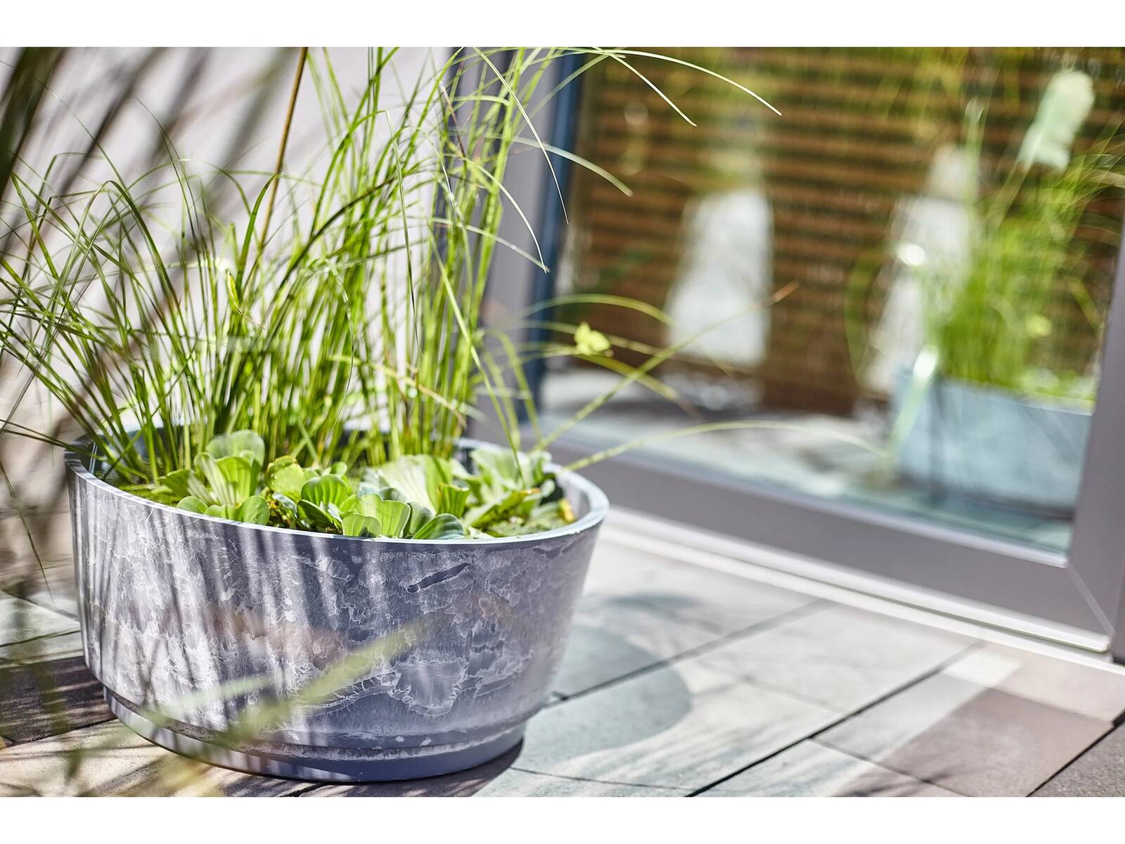 Die Schale aus wetterfestem Polyresin misst 46 mal 46 Zentimeter und zeigt sich in einer hellgrauen Betonoptik. Ihre Oberfläche wirkt zeitlos und fügt sich harmonisch in moderne wie klassische Gartenkonzepte ein. Mit nur 21 Zentimetern Höhe eignet sich das Becken auch für kleinere Flächen, ohne wuchtig zu wirken.