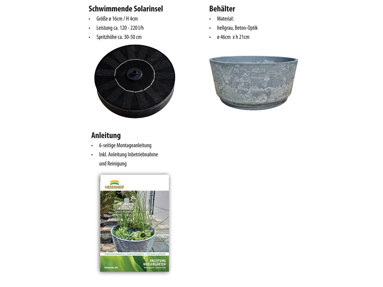 Für die Gestaltung reicht ein wenig Kreativität: Wasser einfüllen, geeignete Pflanzen einsetzen, das Spiel des Wassers genießen. Besonders schön wirken schwimmende oder am Rand platzierte Pflanzen, die das Gesamtbild abrunden. Dabei bleibt dir der Blick auf das Wasserspiel nicht verwehrt. So entsteht ein persönlicher Rückzugsort mit natürlichem Charakter. Die ausführliche Anleitung erklärt Schritt für Schritt den Aufbau – ganz ohne komplizierte Technik oder Vorwissen. Im Lieferumfang enthalten: Schale aus Kunststein in Betonoptik, schwimmende Solarpumpe mit Wasserspiel, ausführliche Anleitung.