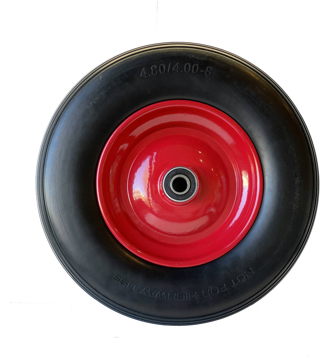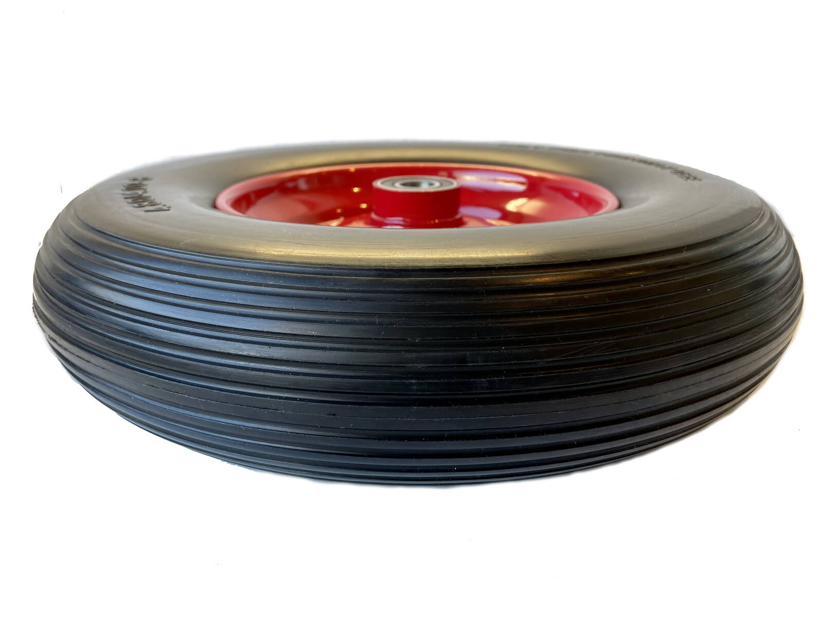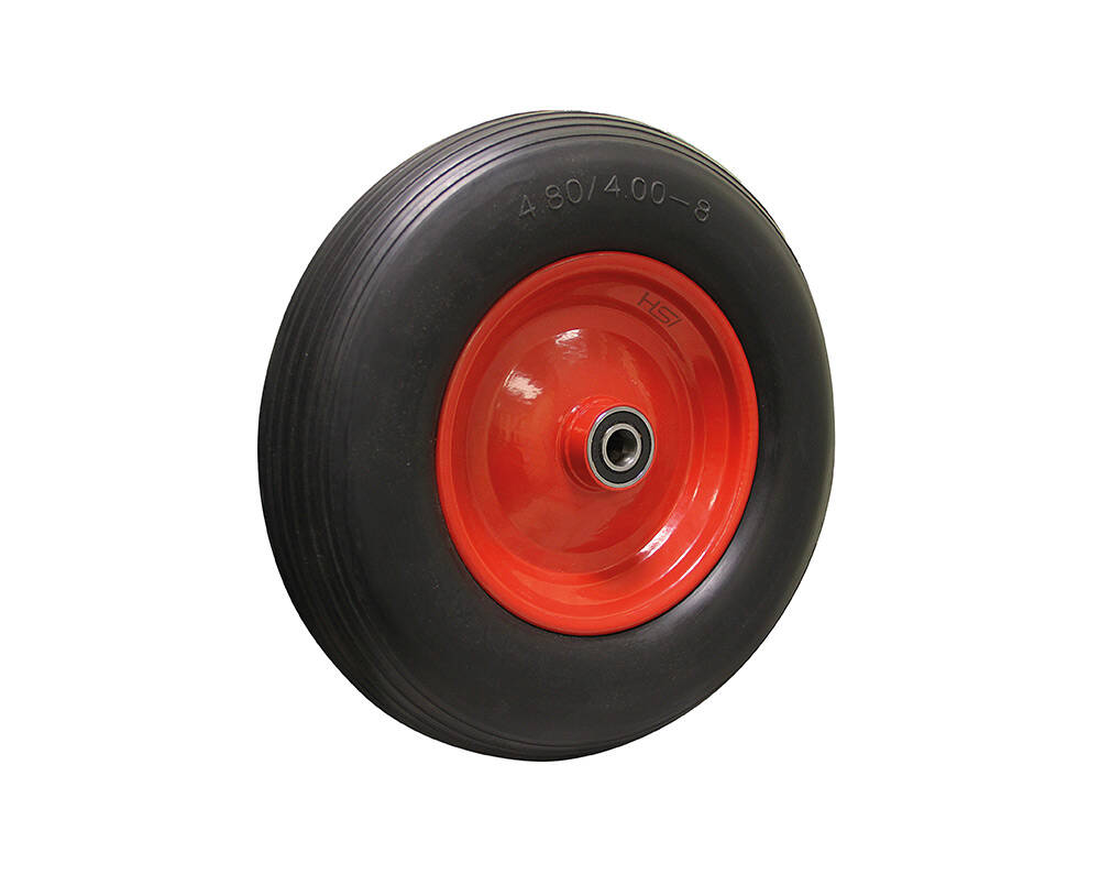 Das pannensichere sowie unkaputtbare Laufrad ist mit einer roten Stahlfelge und einem Präzisionskugellager ausgestattet. Durch die robuste PU-Bereifung ist das Rad ideal für unebenes Gelände geeignet und kann allgemein gut auf verschiedenen Untergründen verwendet werden. Der Raddurchmesser beträgt 400 Millimeter bei einer Radbreite von 100 Millimeter. Den Nabendurchmesser gibt HSI mit 200 Millimetern an.