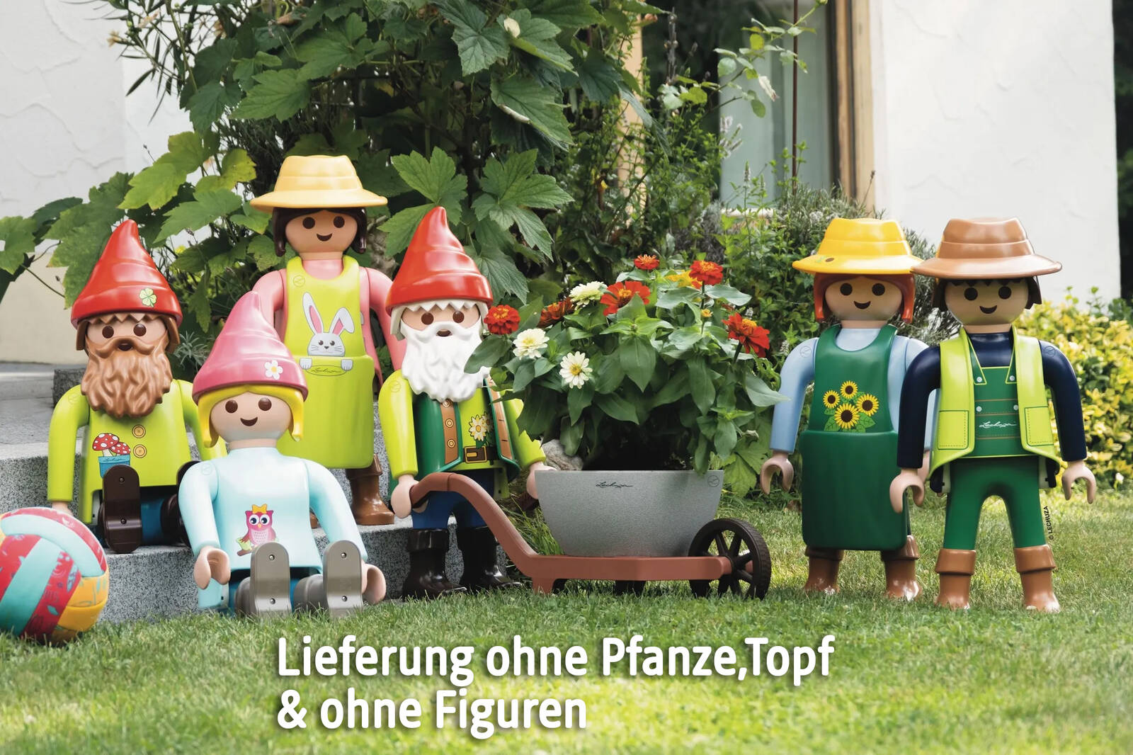Die Griffe der Schubkarre sind exakt auf die Hände der rund 65 Zentimeter großen Figuren abgestimmt. So können deine XXL-Figuren sie wirklich halten und in Szene setzen. Besonders schön wirkt die Kombination mit der separat erwerblichen Pflanzschale BACINO 30 oder CUBETO 30, die perfekt in die Schubkarre passt. Damit lassen sich Pflanzen, Deko-Elemente oder kleine Accessoires auf originelle Weise präsentieren. Ein echtes Highlight entsteht, wenn du die PLAYMOBIL LECHUZA Schubkarre mit der Figur des Gartenzwergs und der Pflanzschale BACINO Cottage 30 in Granit kombinierst. So entsteht eine harmonische, detailverliebte Gartenszene, die garantiert für Gesprächsstoff sorgt.