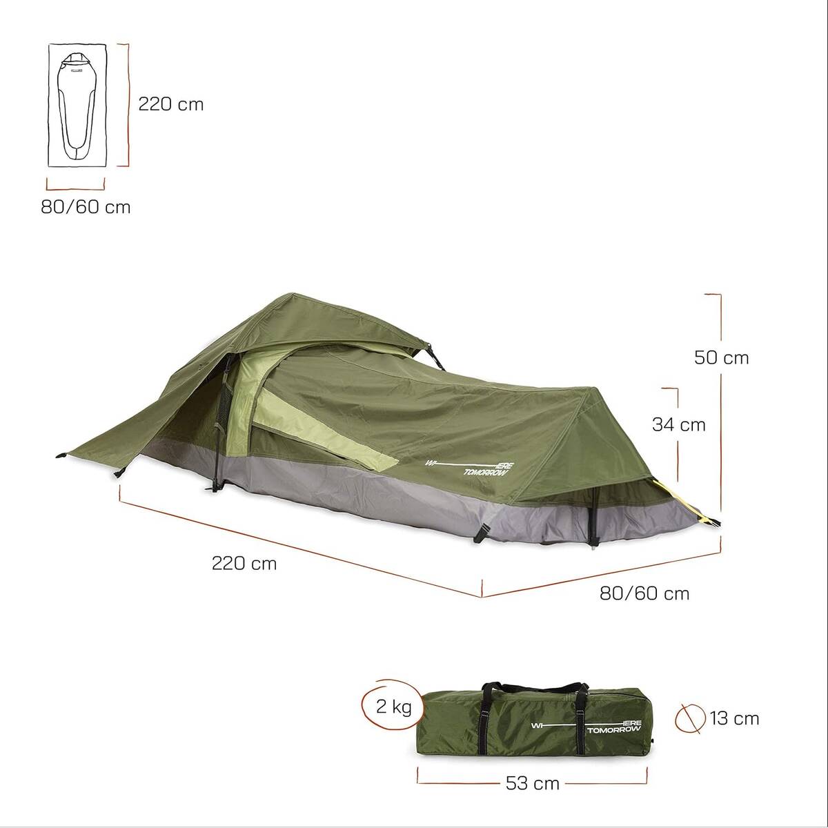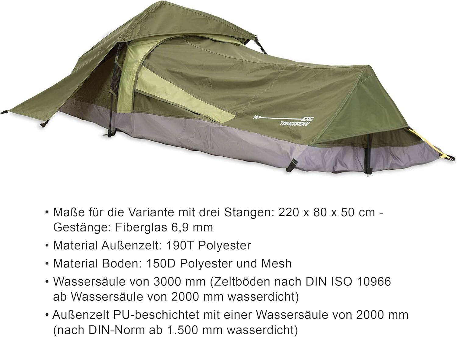 Das geringe Gewicht von zwei Kilogramm macht den Transport von WhereTomorrow leicht. Außenzelt und Innenzelt sind schon verbunden. Das erleichtert den Aufbau um ein Vielfaches. Die Lumaland Solozelt-Variante mit drei Stangen misst 220 x 80 x 50 Zentimeter, das Gestänge besteht aus robustem Fiberglas (6,9 Millimeter). Das Außenzelt besteht aus 190T-Polyester mit PU-Beschichtung und einer Wassersäule von 2000 Millimetern. Der Boden aus 150D-Polyester bietet mit einer Wassersäule von 3000 Millimetern zusätzlichen Schutz vor Nässe.