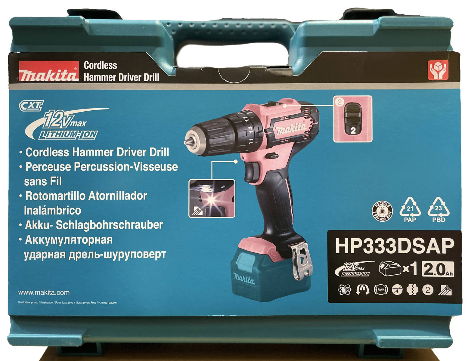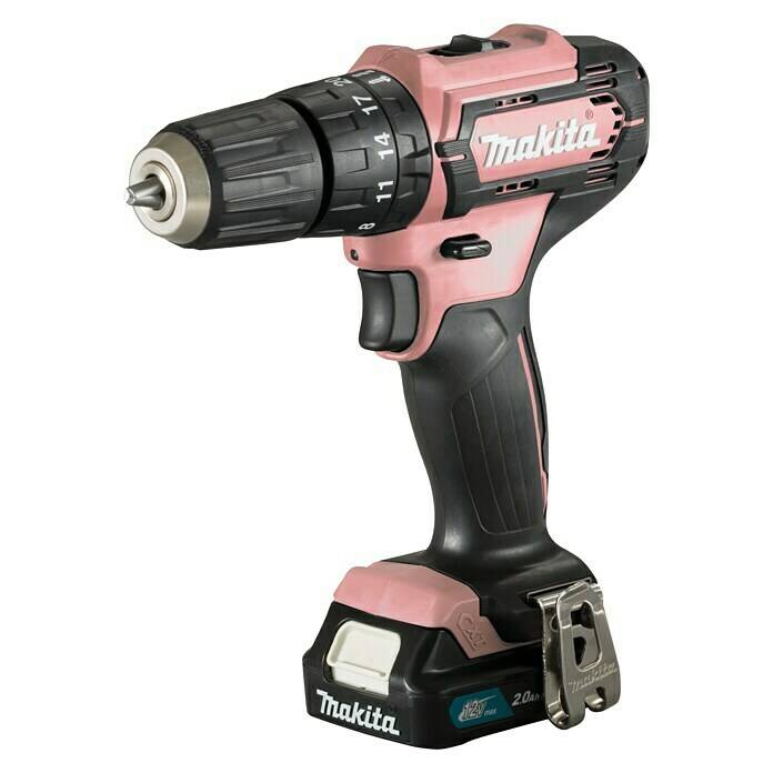 Der Makita HP333DSAP im stylisch pinken Farbton ist nicht nur schick anzuschauen. Klein aber Oho ist hier das Stichwort. Der 12 Volt max. Akku-Bohrschrauber von Makita überzeugt durch ausreichend Leistung trotz seiner kompakten Größe. Zusätzlich besitzt der kleine Heimwerker eine enorme Ausdauer sowie viele Extra-Funktionen. Stellen Sie über Drehen des Bohrfutter-Rings das Drehmoment in unterschiedliche Stufen ein. Für das Schrauben in weiche Werkstoffe (wie Pressspan-Schränke) wählen Sie ein geringes Drehmoment. Die Maschine stoppt den Motor bei Erreichen des Moments, um die Schraube nicht zu tief eindringen zu lassen. Zusätzlich verfügt der HP333DSAP von Makita über zwei Gänge beziehungsweise Getriebe-Stufen. Ob Schrauben oder Bohren - Mit dem leichten sowie kompakten Schrauber sind Sie immer gut gerüstet. Die vormontierte Schnalle aus Metall gehört mit zur Ausstattung des Sets. Hängen Sie den Schrauber bei kurzen Pausen oder den Griff in die Schraubentasche an den Gürtel, um anschließend wieder durchzustarten. Für die großzügige Ausdauer spendiert Makita dem HP333DSAP einen effizienten Lithium-Ionen-Akku mit 2.0 Ampere Stunden. Das dazugehörige Ladegerät für das CXT Akku-System liefert der Makita gleich mit. Ordnung und Sicherheit sind alles. Sämtliche Teile des Sets sind sicher im stabilen Hardcase-Koffer verstaut. Praktisch. Auch für kleinere Ecken wie zum Beispiel im Keller mit wenig Licht eignet sich das Modell bestens. Durch sein geringes Produktgewicht und die kompakten Maße schraubt & bohrt es sich flexibel. Sobald der Akku-Bohrschrauber startet, schaltet sich das integrierte Arbeitslicht mit leuchtstarker LED zu. Ein echtes Multitalent der Akku-Bohrschrauber. Stellen Sie darüber hinaus den Rechts/Linkslauf via Knopfdruck um. Ebenso lässt sich die Schlagbohrfunktion bei Bedarf schnell an- oder abschalten. Holen Sie noch einmal mehr aus dem Schrauber heraus. Egal ob Werkstattarbeiten, Möbel zusammenschrauben oder mehr. Der kleine Kraftprotz HP333DSAP fühlt sich überall wohl. Ausdauernd, kraftvoll und schnurlos.