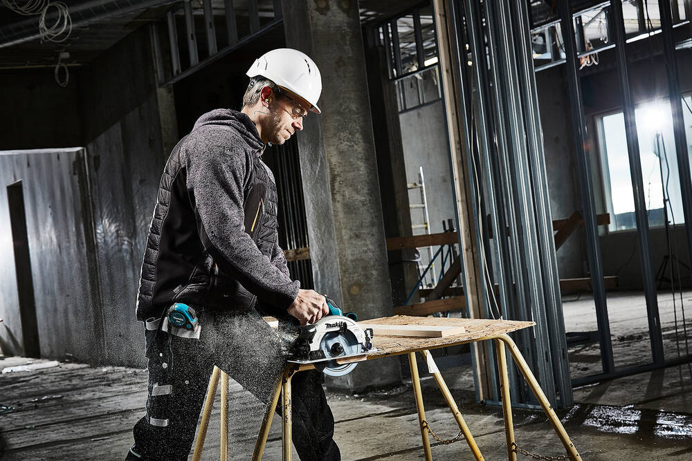 Kompakt, leistungsstark und vollgepackt mit Technik. Das ist die Makita Akku-Handkreissäge DHS660Z. Wir lieben gerade Schnitte! Besitzen sie bereits 18V LXT Akkus plus Schnellladegerät von Makita, ist die DHS660Z das ideale Sologerät. Der Hersteller selbst bezeichnet die Säge als professionelles Tool mit bürstenlosem Motor sowie handlich-kurzer Bauform. Der bürstenlose Motor sorgt für mehr Ausdauer und eine längere Lebensdauer. Besagte Kurz-Bauform profitiert ebenfalls von dieser innovativen Motorart. Mit einer leuchtstarken Doppel-LED Einheit ausgestattet arbeiten Sie selbst in dunklen Bereichen oder Werkstätten, Garagen oder Kellerräumen. Des Weiteren stattet Makita die DHS660Z mit Tiefenentladeschutz aus. Selbiger sorgt dafür, dass sich die Akku-Handkreissäge automatisch abschaltet wenn der Akku fast entehrt ist. Dank Akku-Ladestandanzeige wissen Sie stets wann das Akkupack neue Energie benötigt. Clever! Die Makita DHS660Z verfügt darüber hinaus über ADT. Was ist ADT für eine Technologie? Automatic-torque-Drive-Technology sorgt für eine automatische Drehzahlregulierung des Sägeblatts. Je nach Anforderung gibt die DHS660Z von Makita die entsprechend benötigte Leistung frei. Damit sie auch am Werkstück selbst nicht den Überblick verlieren, lässt sich der Frontgriff in seiner Position leicht verstellen. Für noch mehr Flexibilität und Sicherheit gehört eine elektronische Motorbremse mit zur Ausstattung. Des Weiteren punktet die Akku-Handkreissäge von Makita mit seiner Neigungseinstellung. Bis zu 50 Grad sind möglich. Hinter dem kryptischen Namen XPT versteckt sich ebenfalls eine sinnvolle Technik. Makita sorgt mit Extreme-Protection-Technology für optimierten Schutz vor Schmutz, Staub und Spritzwasser. Was will man mehr auf der Baustelle? Die integrierte Blasvorrichtung hält die Schnittstelle sauber. Eine Staubabsaugung ist möglich (Zubehör separat erhältlich).