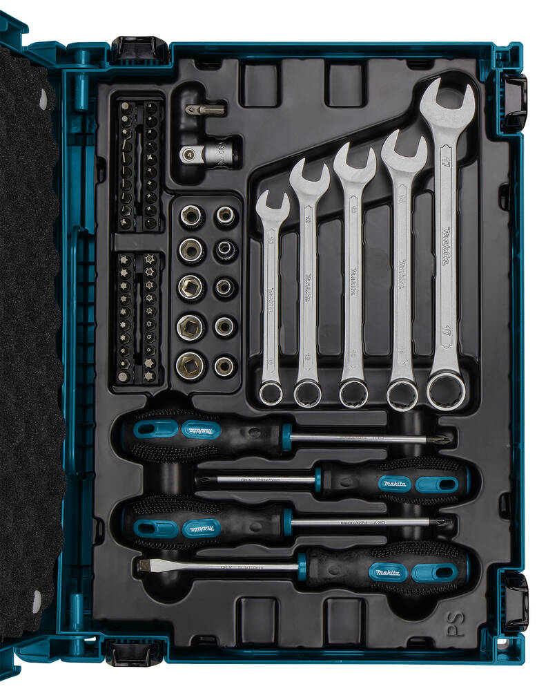Mit dem 87-teiligen Makita Werkzeug-Set E-11542 bist du für dein nächstes Handwerksprojekt bestens gerüstet. Das umfangreiche Set eignet sich perfekt für Arbeiten in der Werkstatt, Montagen oder in den eigenen vier Wänden. Die Werkzeuge sind aus robustem Chrom-Vanadium-Stahl gefertigt und ermöglichen einen zuverlässigen Einsatz. Dank des gut sortierten MAKPAC Gr. 1 Systemkoffer werden alle Teile schnell gefunden und sicher verwahrt. Im Set enthalten sind: