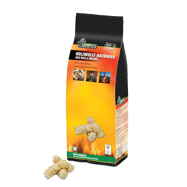 Bio-Holzwolle-Anzünder für den Kamin, Grill oder Ofen. Besondere Brennstärke durch Kerzenparaffin. Leicht und einzeln dosierbar aus natürlichen Rohstoffen. Herstellung gemäß DIN EN 1860-3.
