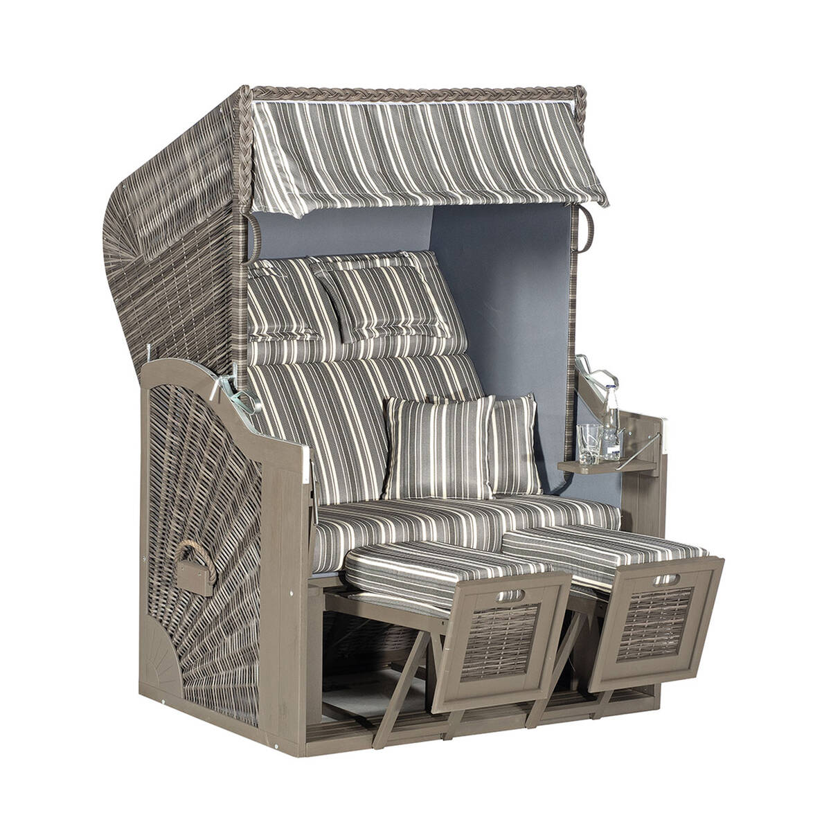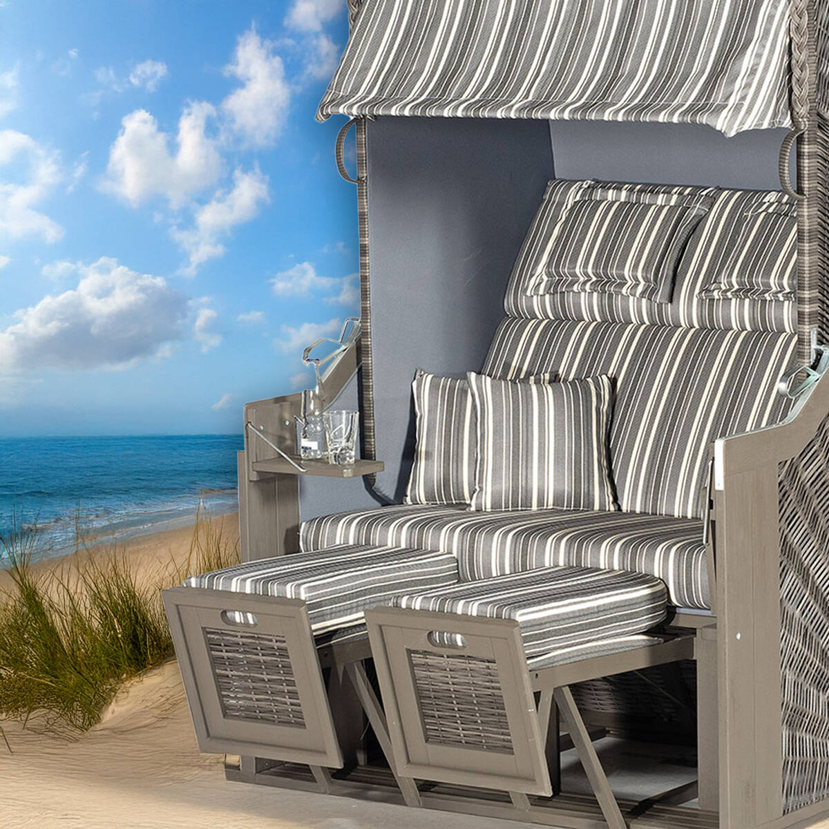 Der Strandkorb Rustikal 285 Z vom Hersteller Sunny Smart vermittelt maritimes Flair und bietet Platz für zwei Personen in klassischer Ostseeform. Das 3/4‑Liegemodell vereint grau lasierte Pinienholz‑Optik mit wetterfestem Kunststoffgeflecht. Die Kunststofffäden in Feinoptik fühlen sich an wie geflochtenes Holz. Sie halten Regen und Sonne stand und erfordern in der Regel kaum Pflege.