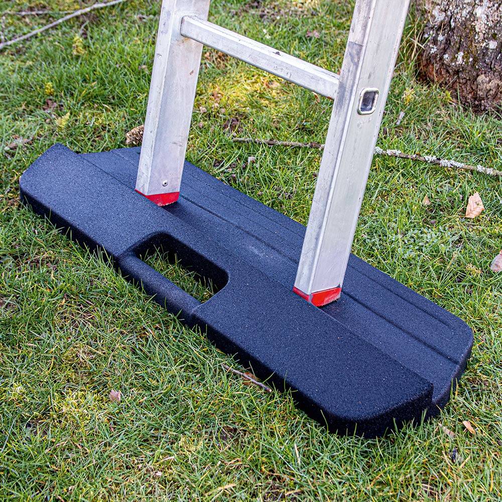Mit dem Terrasoft Rutschstopp erreichen Sie höchste Standfestigkeit von Leitern auf glatten Böden. Das Element aus rutschhemmendem, flexiblen SBR-Gummigranulat passt sich den Untergründen an und ermöglicht so einen sicheren Stand. Die Leiter kann aufgrund der abgewinkelten Bauweise nicht nach hinten wegrutschen. Besonderes Plus: auf weicheren Untergründen wie Rasen verhindert der Terrasoft Rutschstopp das Einsinken von Leitern. Neben Leitern können auch andere Bauteile wie Glas- oder Holzplatten perfekt auf dem Rutschstopp gelagert werden. Das Material schützt sowohl Boden und Untergründe als auch empfindliche Komponenten, die auf den Rutschstopp gestellt werden. Mit Hilfe des integrierten Tragegriffs kann das Element schnell und einfach transportiert werden.