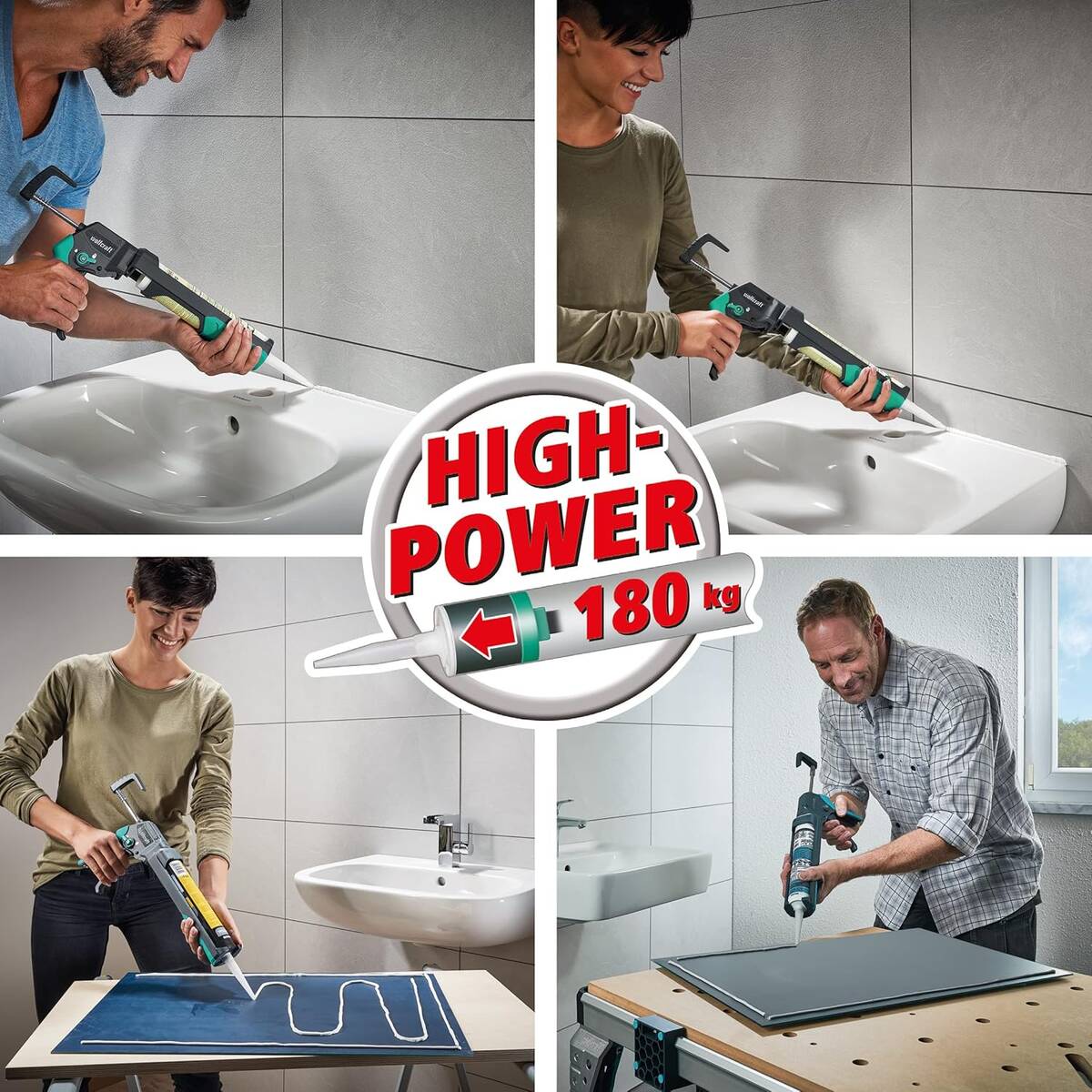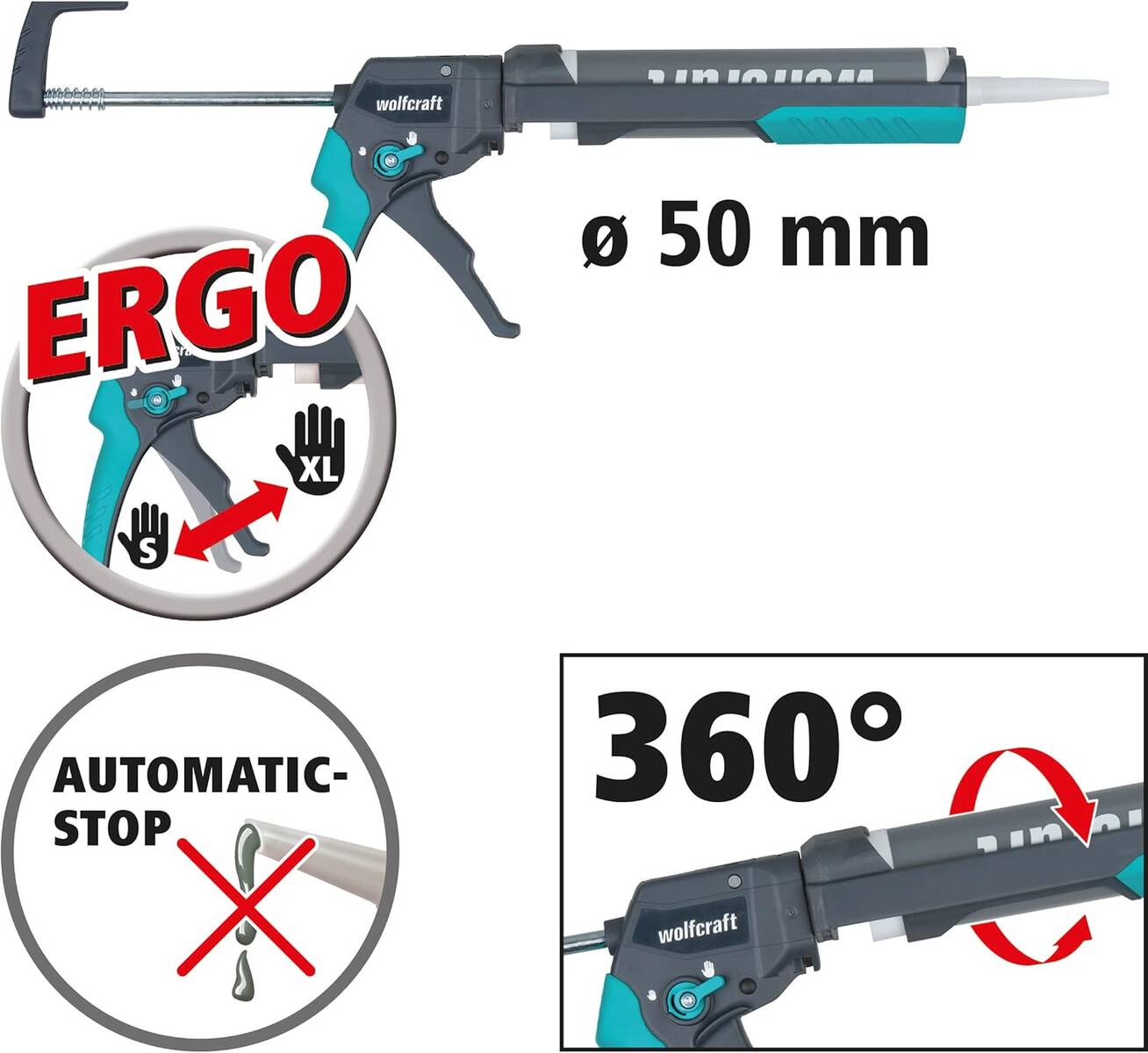 Dank der starken Vorschubmechanik können Sie mit der MG 400 ERGO neben Silikon und Acryl auch Klebstoffe mühelos und kraftschonend verarbeiten. Geeignet für 310-ml-Kartuschen. Die Kartuschenpistole lässt sich dank der Griffweitenverstellung komfortabel auf die Handgröße des Anwenders einstellen. Zusätzlich unterstützt der ergonomisch geformte 2-Komponenten-Griff ermüdungsarmes Arbeiten, selbst bei längerer Anwendung. Die Kartuschenschale ist um 360° drehbar, dadurch können Sie den Arbeitswinkel in der Anwendung flexibel anpassen. Sollten Sie eine freie Hand brauchen, hängen Sie die MG 400 ERGO an dem praktischen Leiterhaken auf. Dabei verhindert der automatische Tropf-Stopp zu jeder Zeit das ungewollte Nachlaufen des Materials.